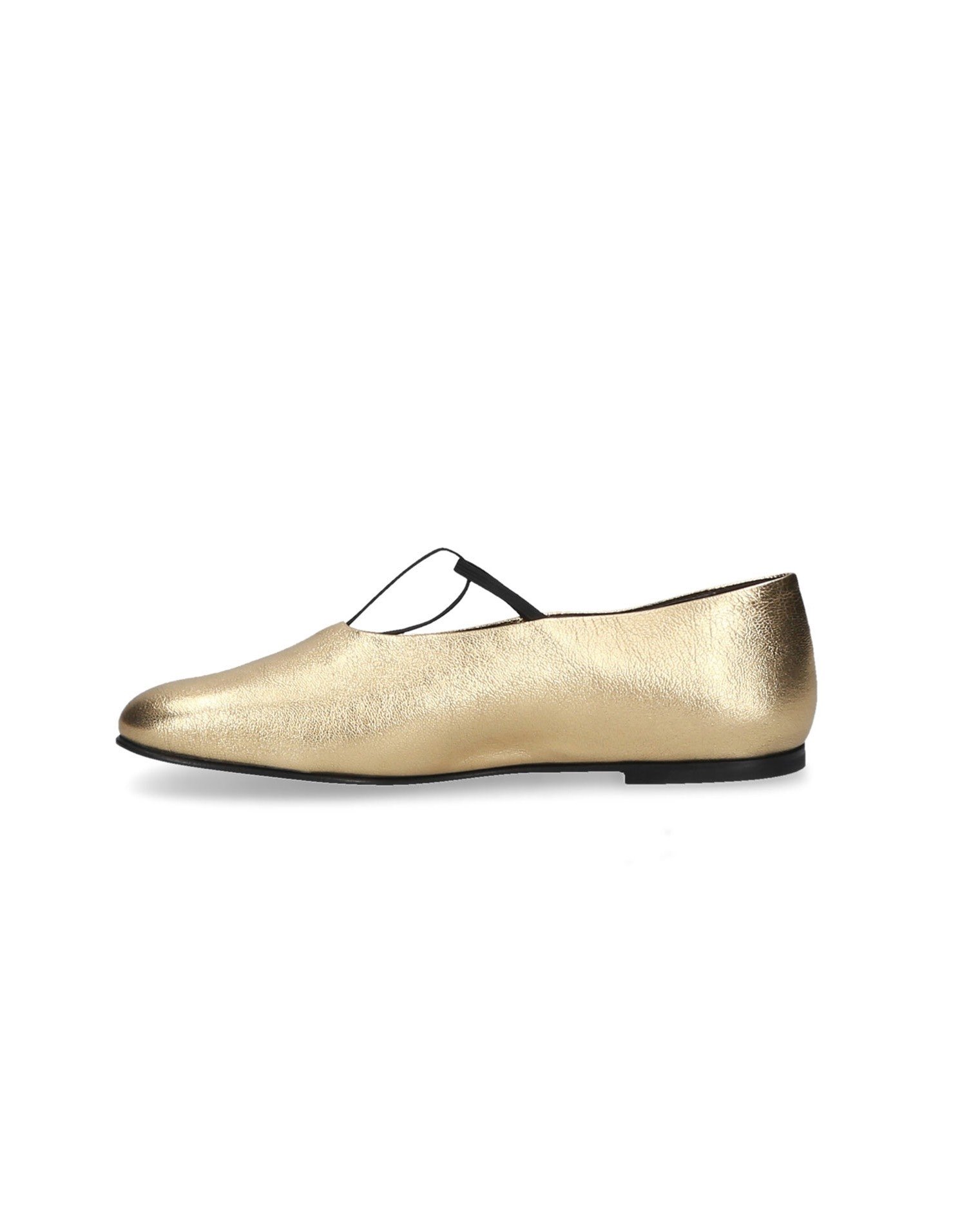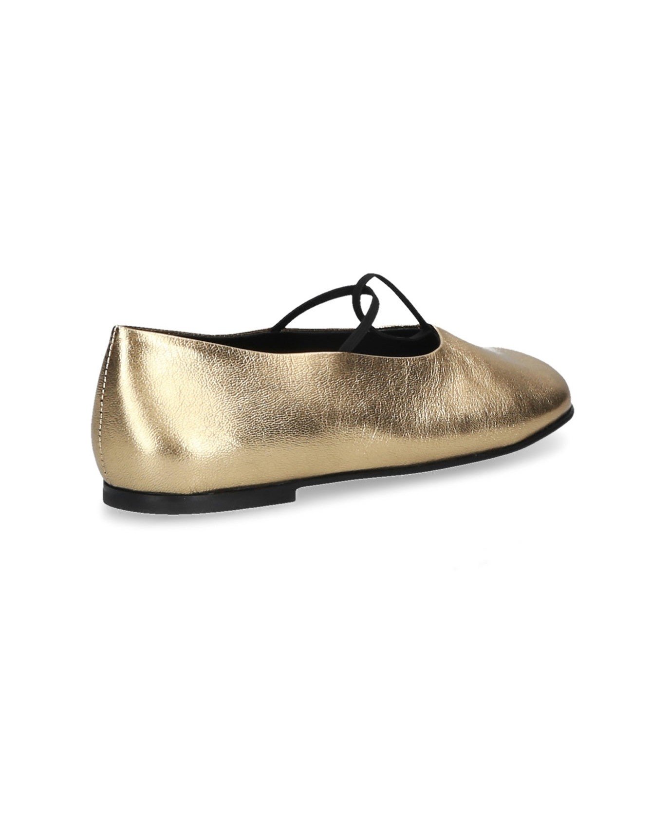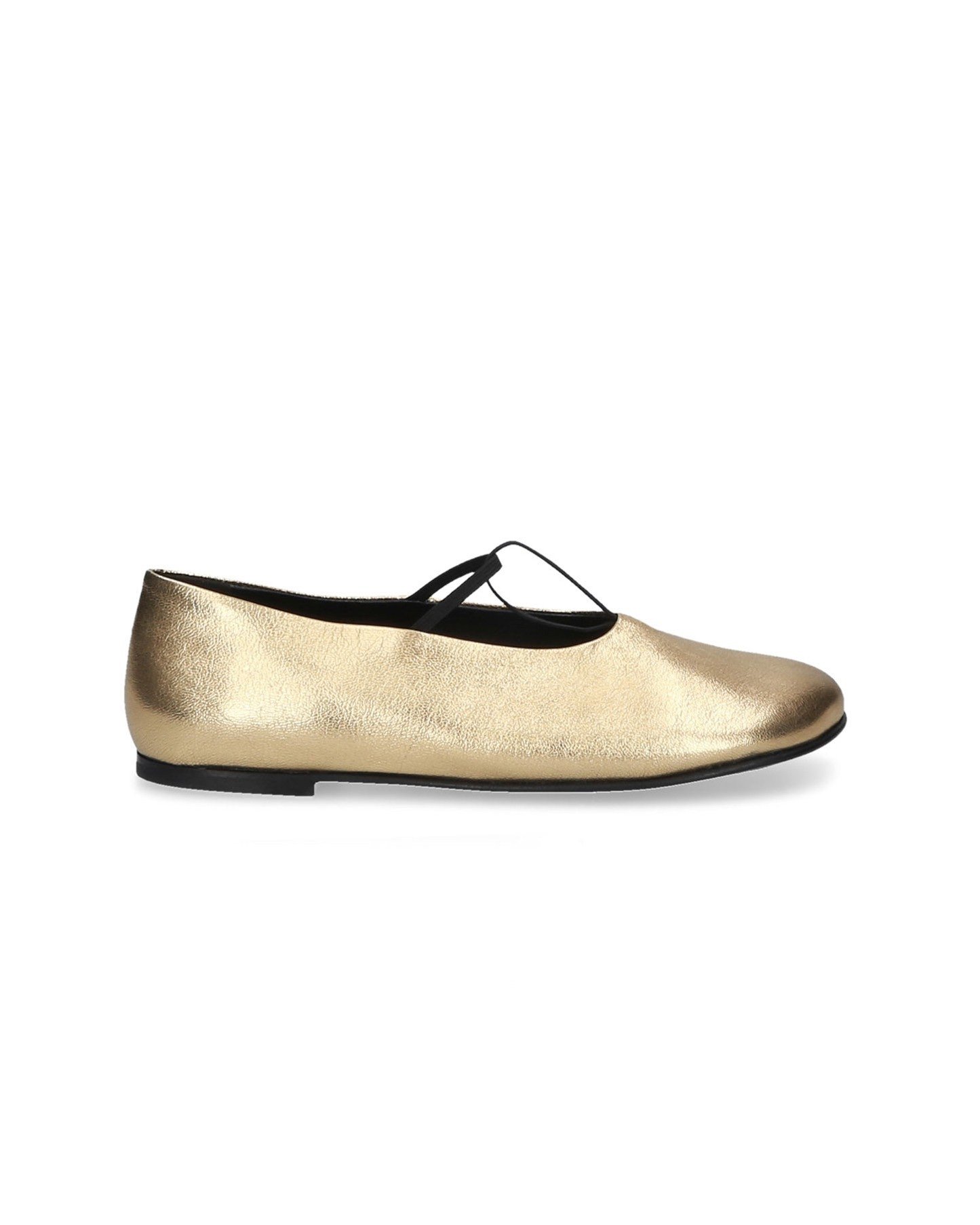 Балетки з м'якої золотої шкіри з витонченим і елегантним дизайном. Звужений силует підкреслюється делікатним перехресним чорним мереживом, що додає вишуканості та жіночності. Гнучка підошва забезпечує абсолютний комфорт, що робить її ідеальною для витонченого та універсального образу, який підходить для будь-якого випадку.