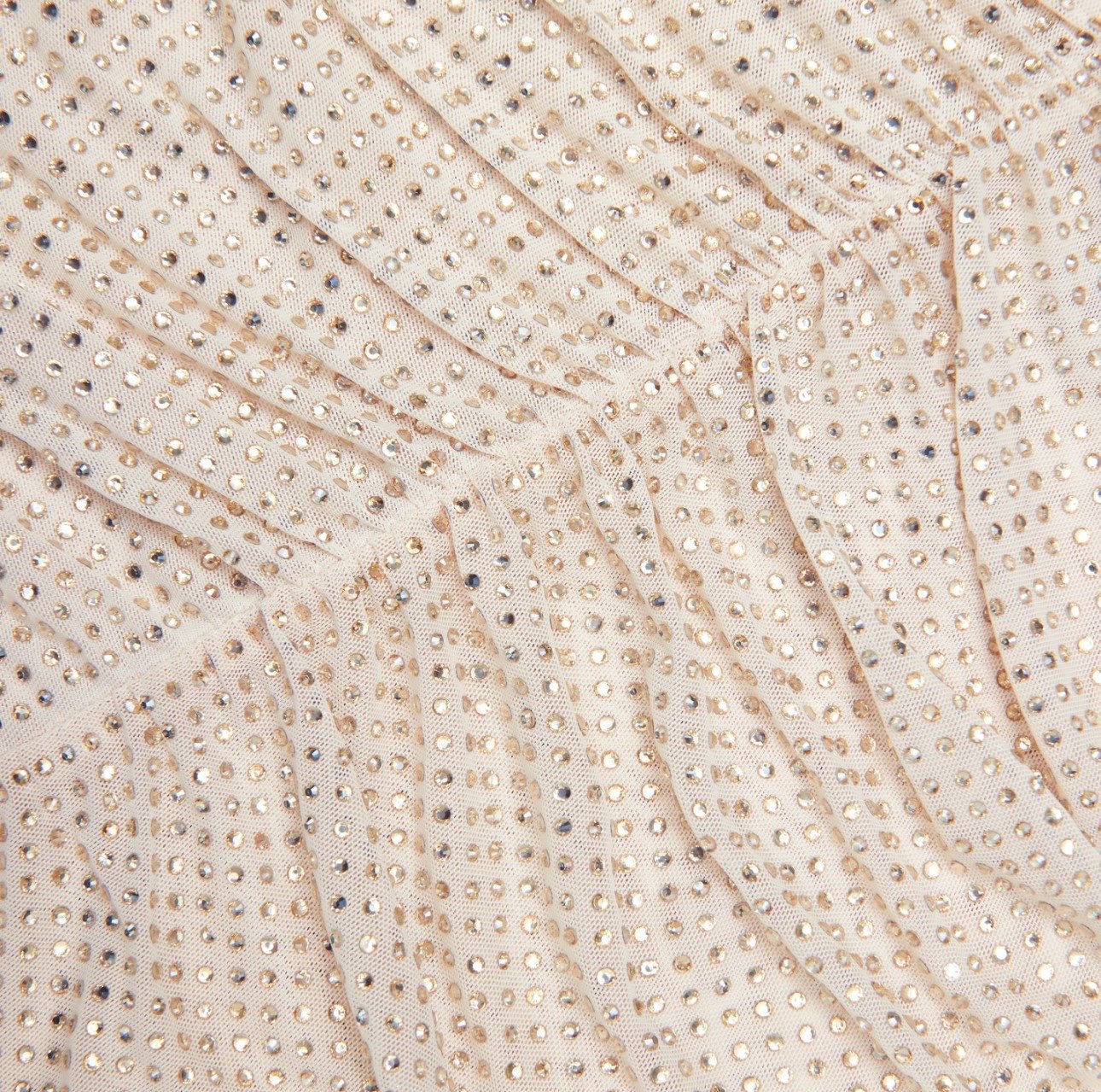 Виготовлений з сітки шампанського кольору, прикрашеної стразами, цей зручний для фотосесії топ поєднує в собі блискучий вигляд із зібраним та рельєфним кроєм. Поєднується з денімом та ефектними сережками для створення невимушеного святкового образу.