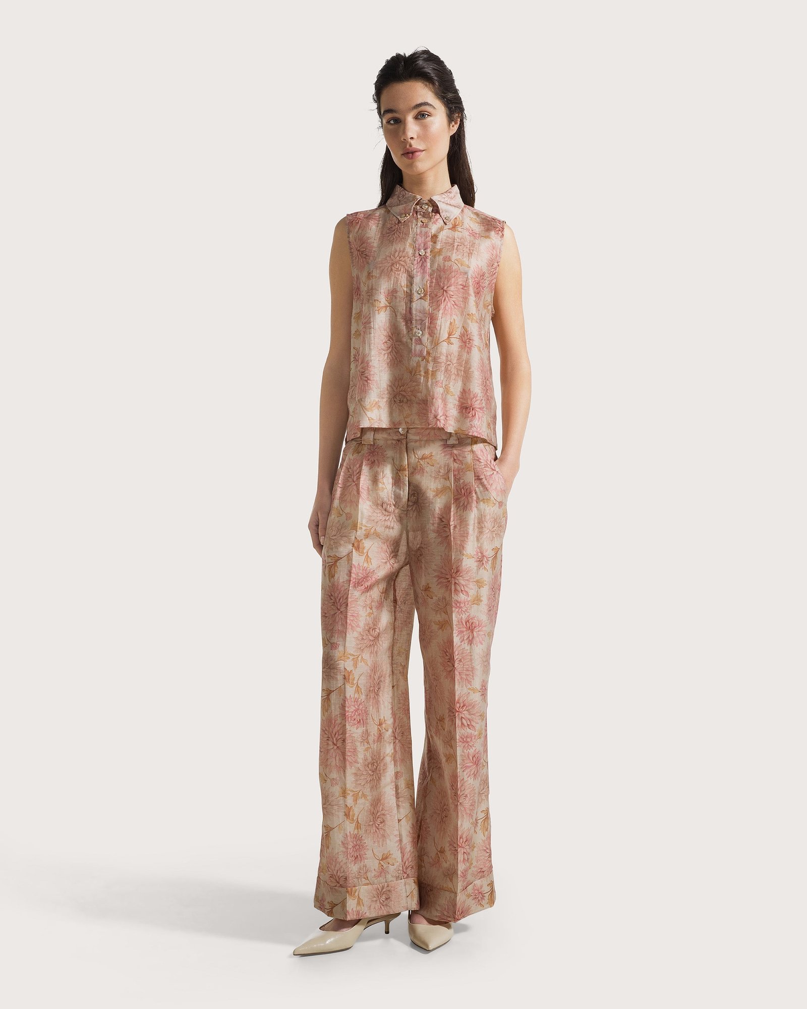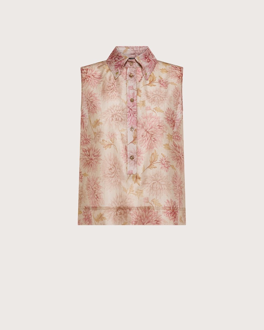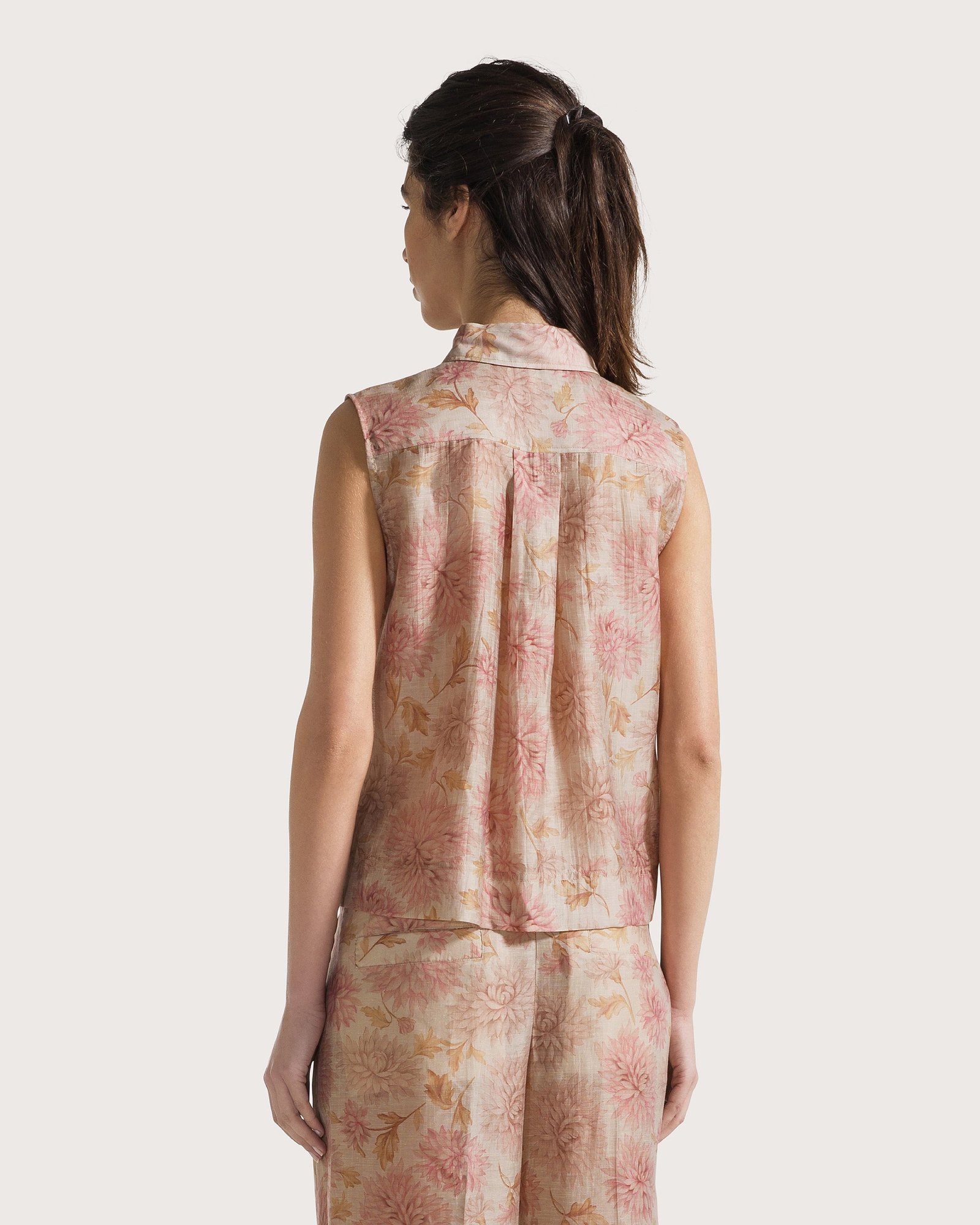 Сорочка без рукавів з льняної органзи з квітковим принтом. Комір на ґудзиках та виріз горловини-поло з перламутровими ґудзиками.