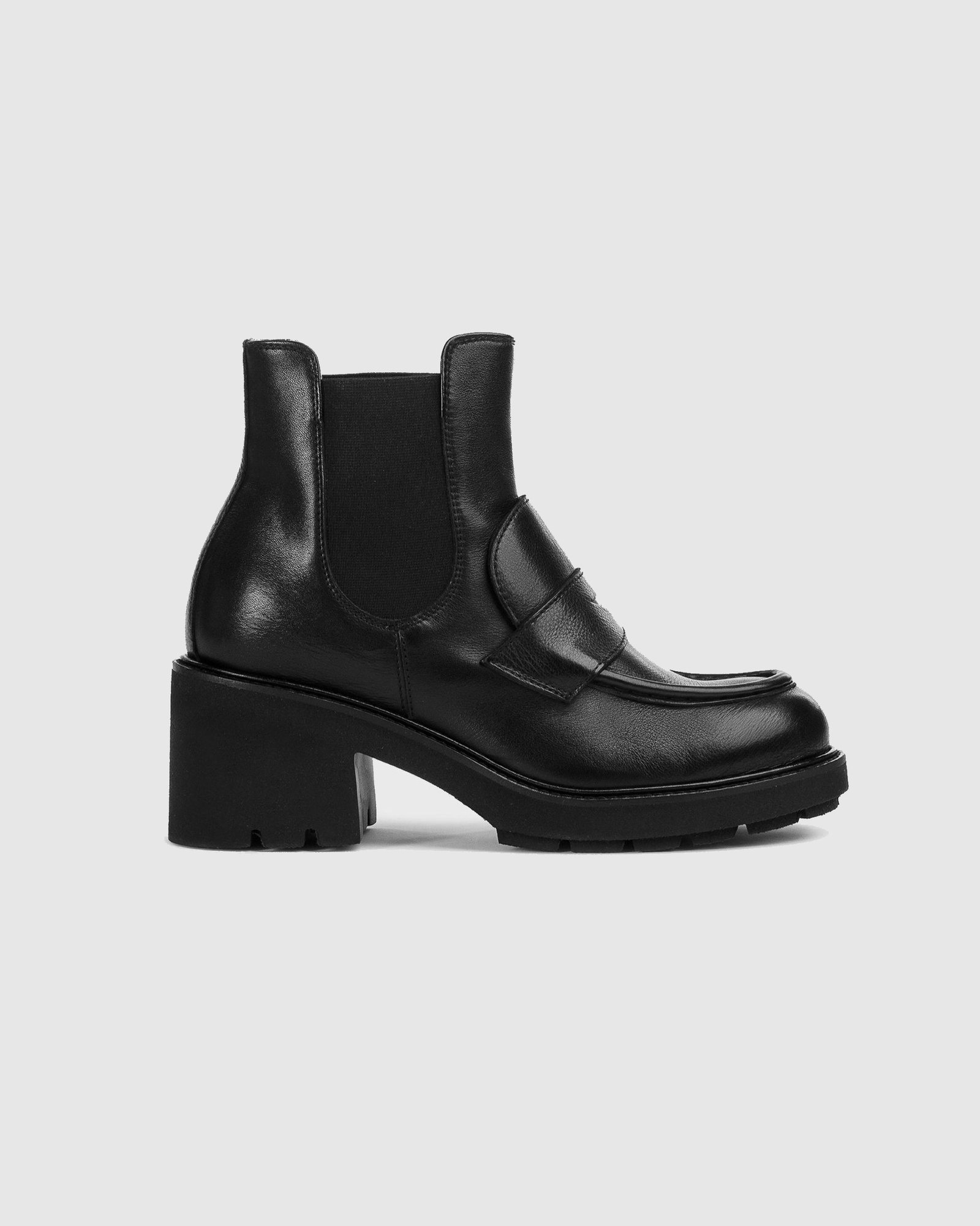 Чорні шкіряні ботильйони на підборах. Класична модель, яка набуває міцності завдяки спеціальній високій гумовій підошві та прошитому рельєфу. Аго обробка з надлегкою гумовою підошвою.