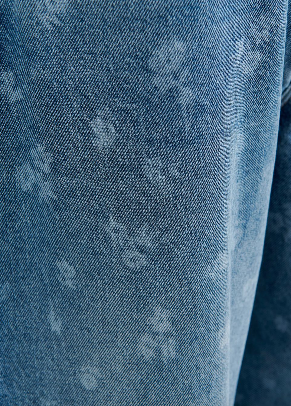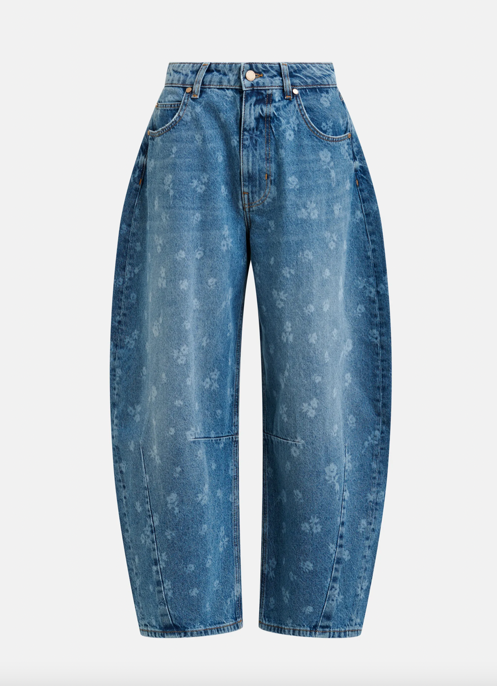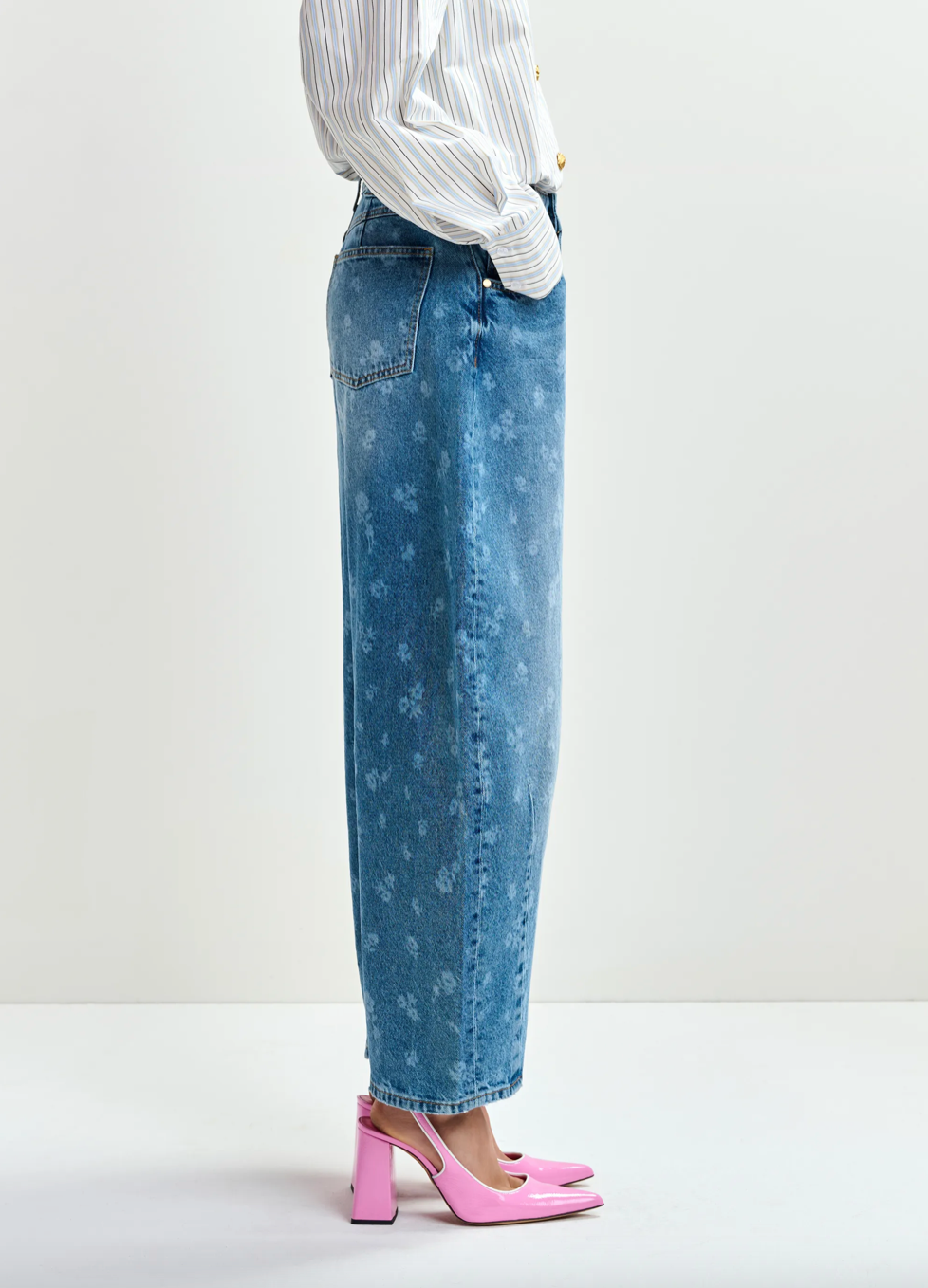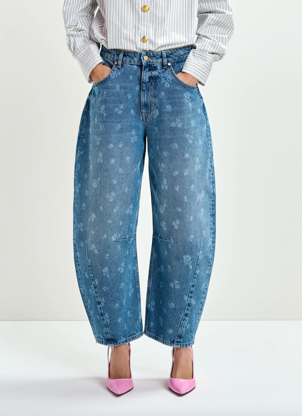 Виготовлені зі 100% бавовни, ці джинси мають високу талію та укорочений крій, що створює сучасний силует «бочкоподібних штанин», який підкреслюється вигнутим зовнішнім боковим швом для ледь помітного деконструйованого ефекту. Денім прикрашений квітковими мотивами світлішого відтінку, що додають м’якого контрасту та об’єму структурованій формі.