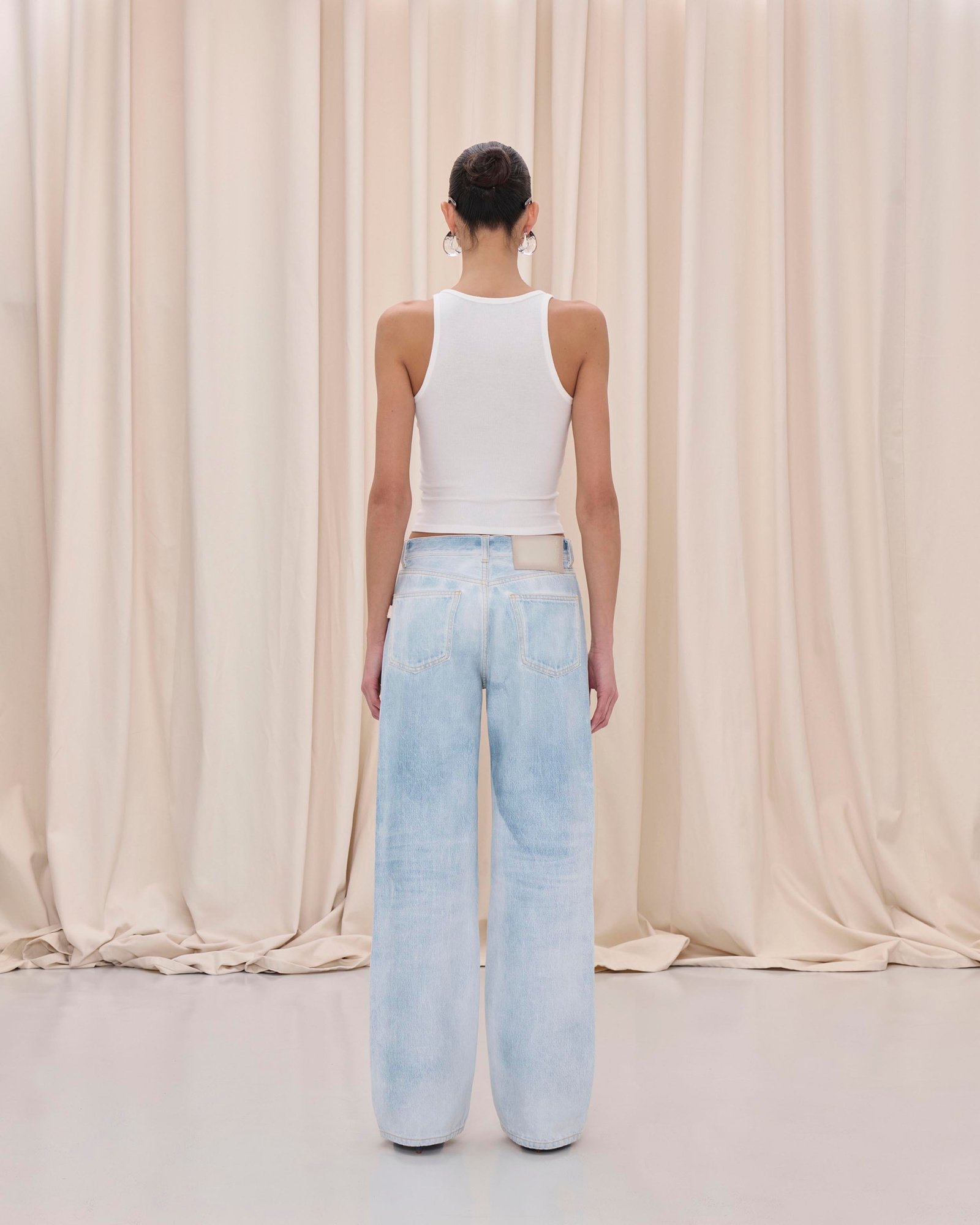Джинс із середньою посадкою, злегка розкльошені штанини, вільний крій.
