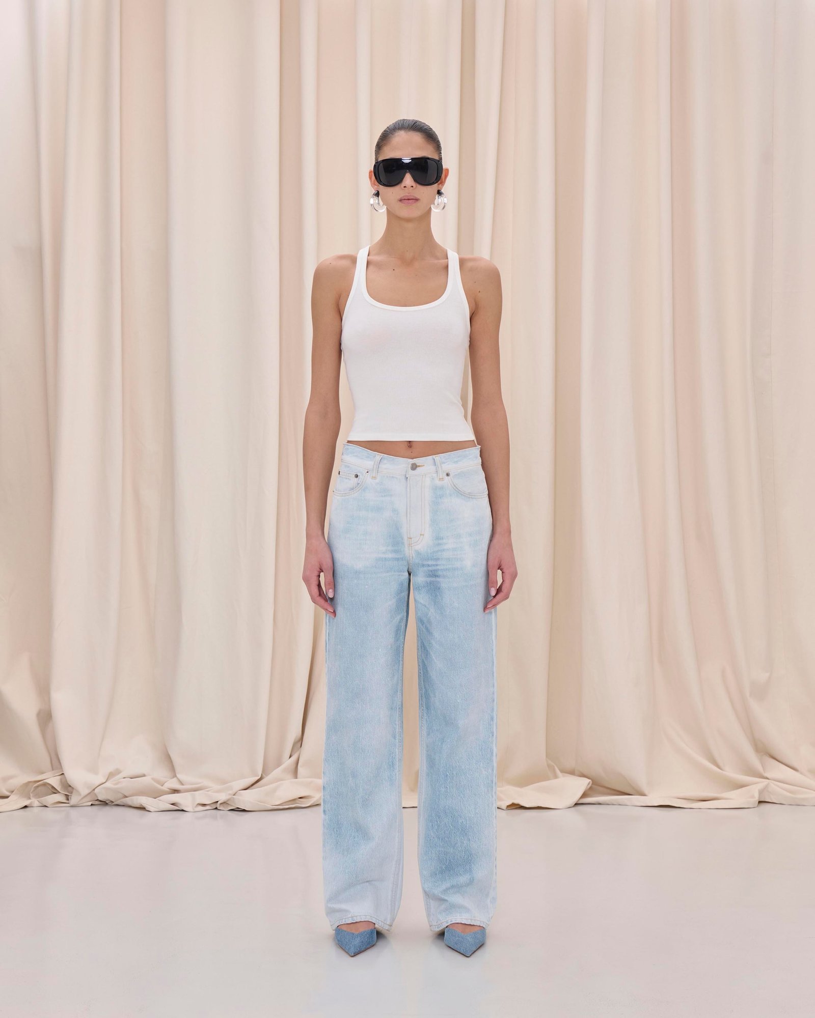 Джинс із середньою посадкою, злегка розкльошені штанини, вільний крій.