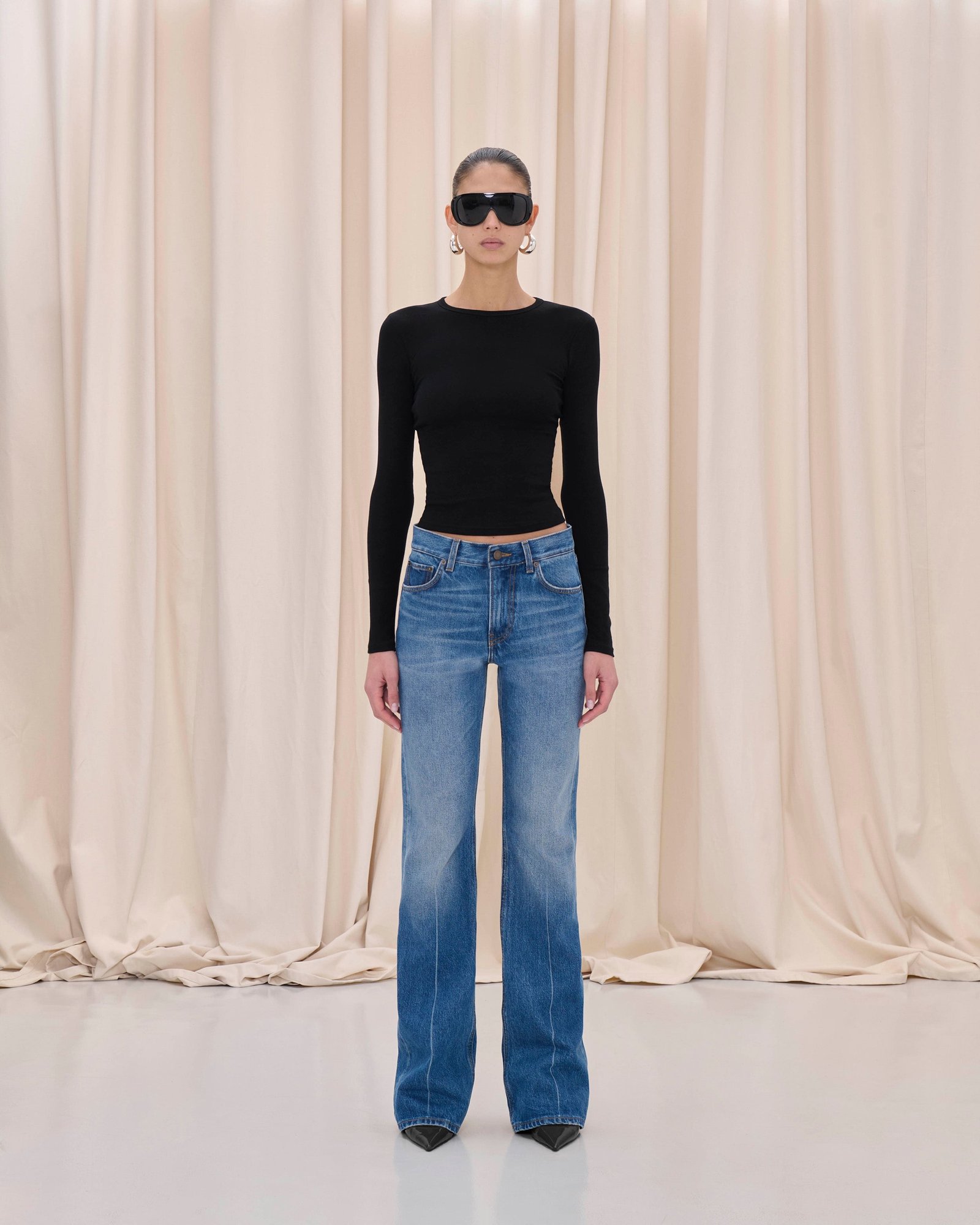 Джинсова тканина розкльошена з високою талією для витонченого силуету.