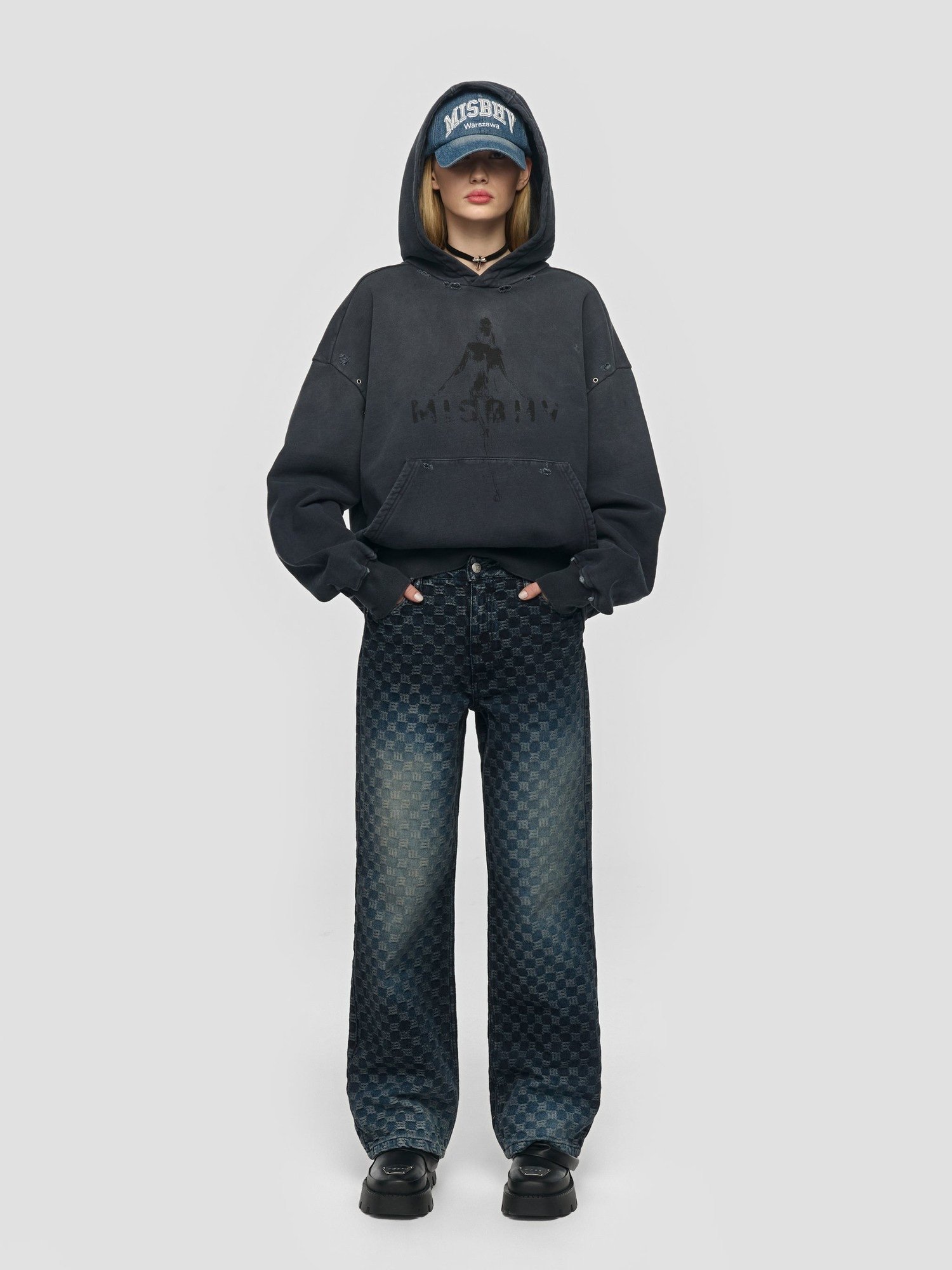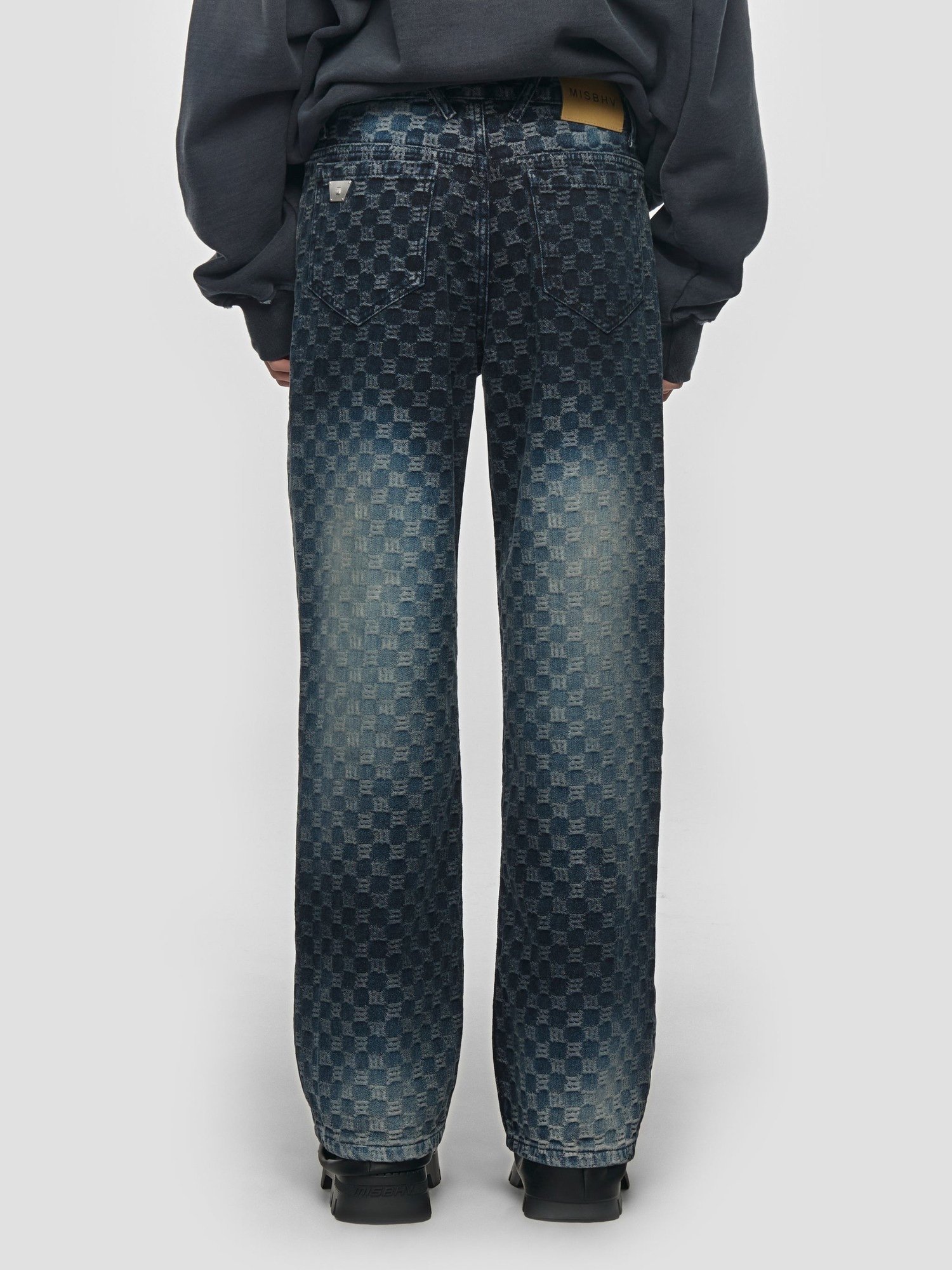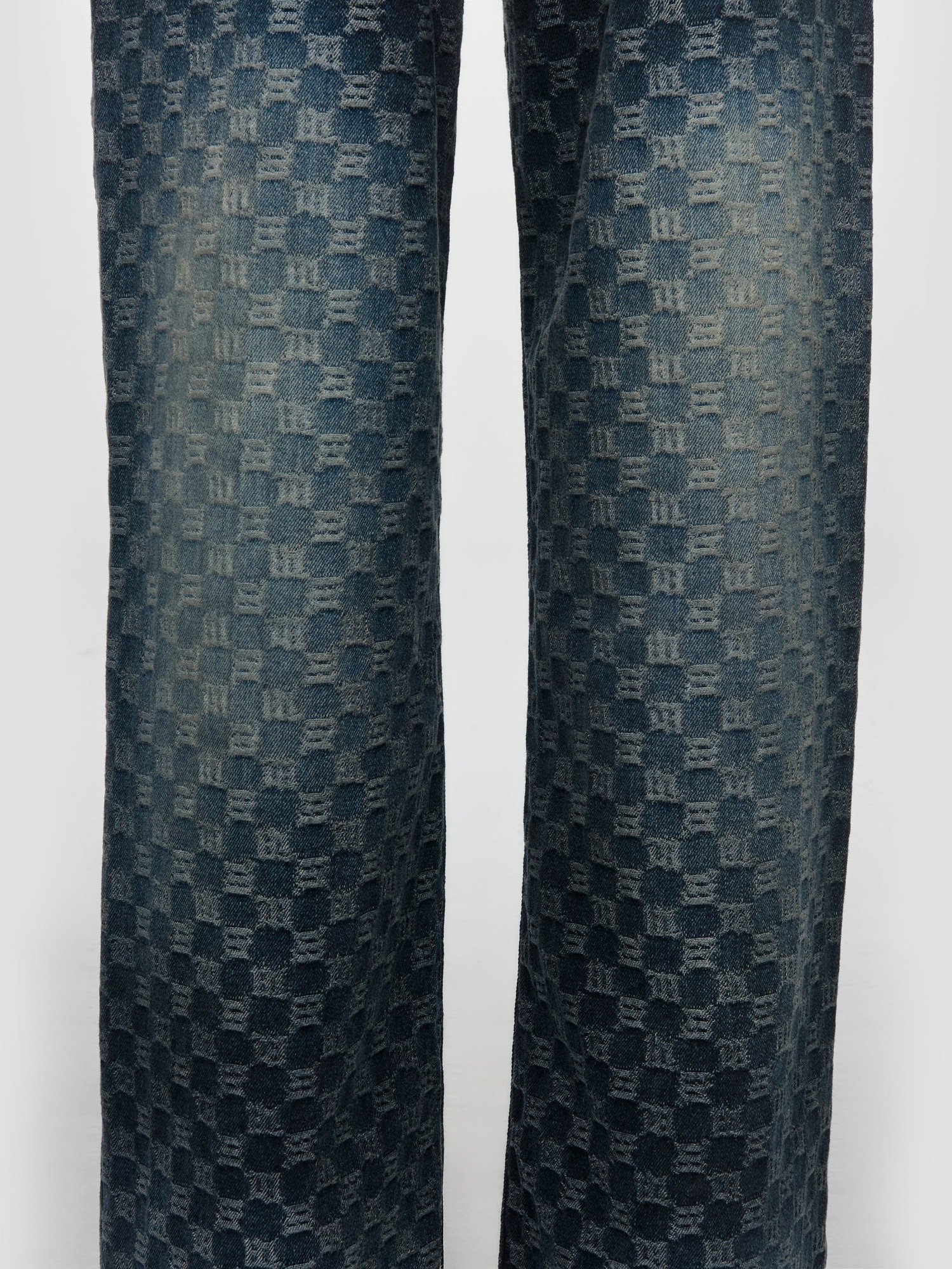 Джинсові штани синього кольору. Вицвілий візерунок з монограмою по всій довжині.