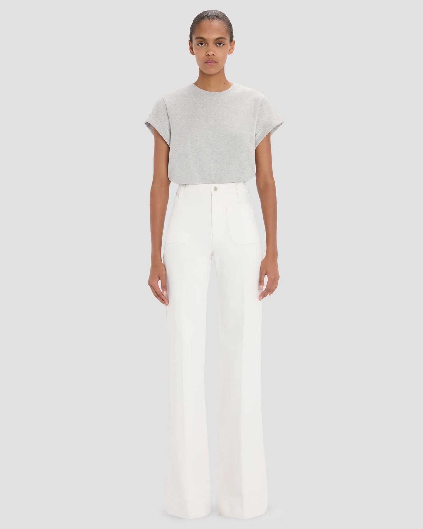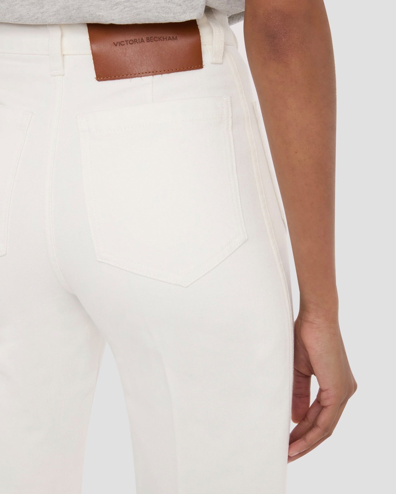 Виготовлені з еластичного деніму, фірмові джинси Alina представлені в кольорі Washed White, що представляє собою стильний варіант утилітарного деніму в стилі преппі. Висока талія та широкі штанини натякають на класичний силует 1970-х років, а традиційні накладні кишені, шкіряна нашивка та вишитий логотип Вікторії Бекхем доповнюють образ.