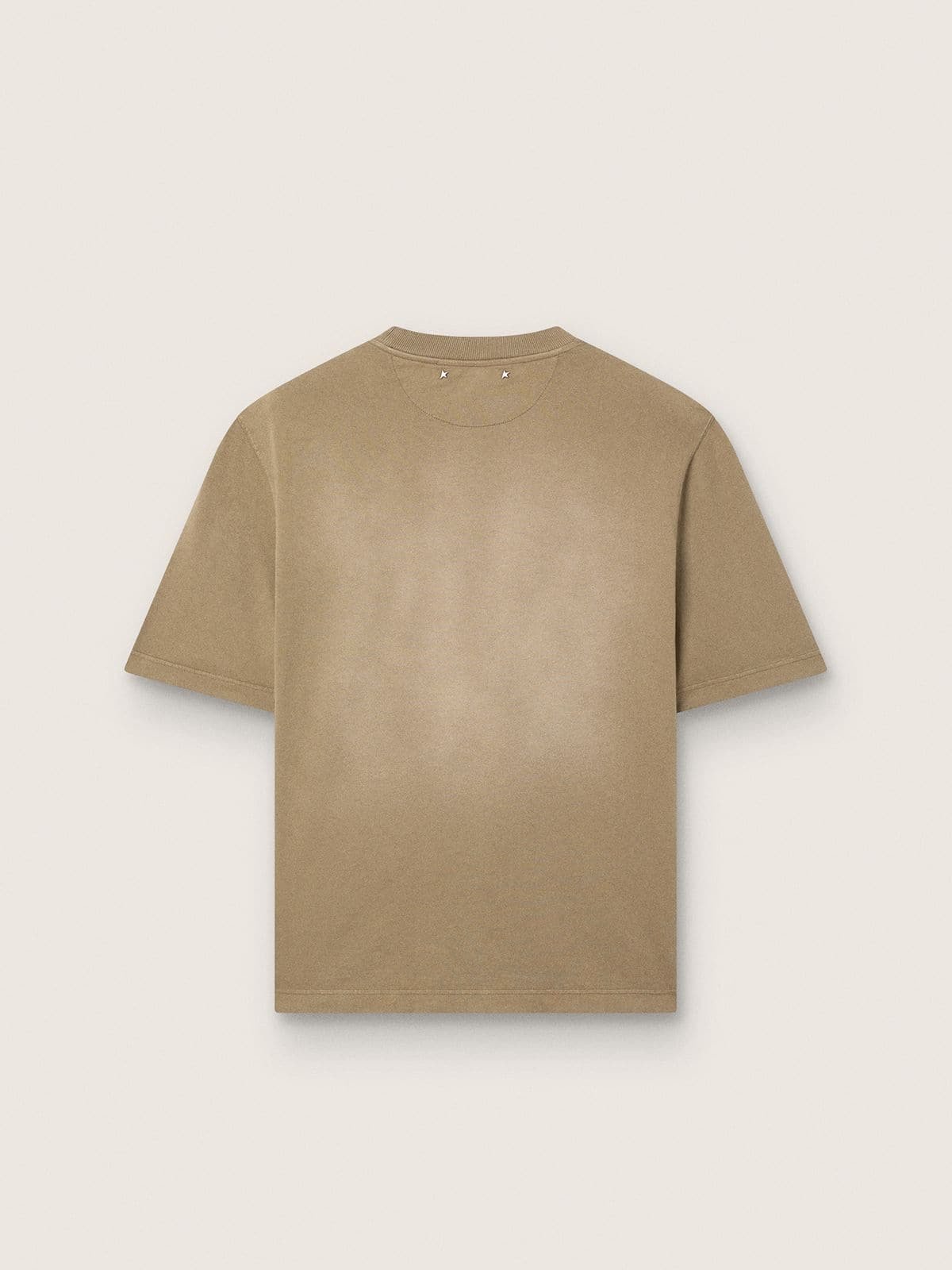 Унісекс-футболка з бежевого бавовняного трикотажу з ефектом «живої шкіри» прикрашена вишитим логотипом у тон спереду. Деталі з ефектом потертості та дві зірки на спині додають завершального штриха.