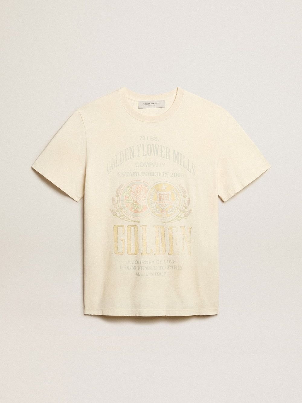 Ця футболка з круглим вирізом із зістареного білого бавовняного трикотажу стандартного крою має сезонний принт спереду. Потерті вручну ділянки по краях і тонке пожовтіння, які надають футболці абсолютно живого вигляду, додають останні штрихи.