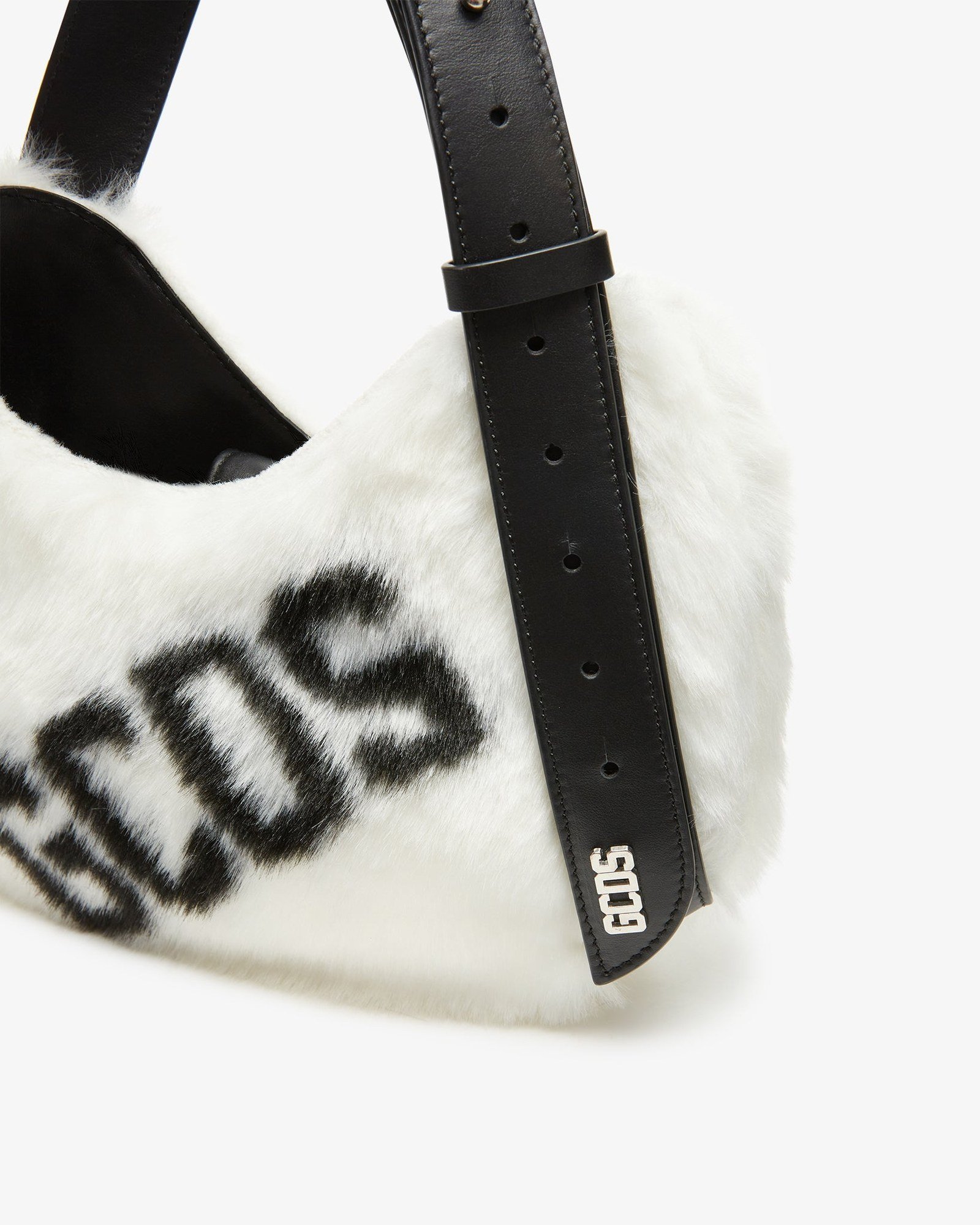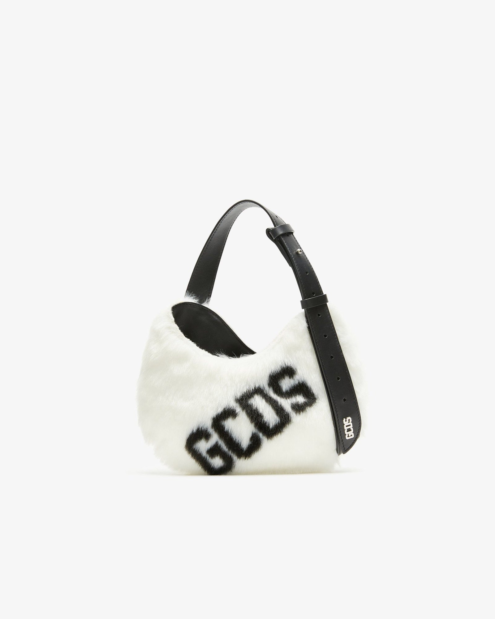 Опис: Маленька сумка-хобо з одним відділенням. Характеризується дзеркально вигнутою формою та регульованою асиметричною ручкою. Має магнітну застібку та поліровану нікелеву табличку з логотипом GCDS на кінці шкіряної ручки. Виготовлена з двоколірного штучного хутра з логотипом і контрастною ручкою. Всередині жаккардова підкладка з логотипом чорного кольору, кишеня на металевій блискавці та знімачі блискавки з логотипом, кільце для ключів і кишеня для карток із термічним тисненням логотипу всередині.