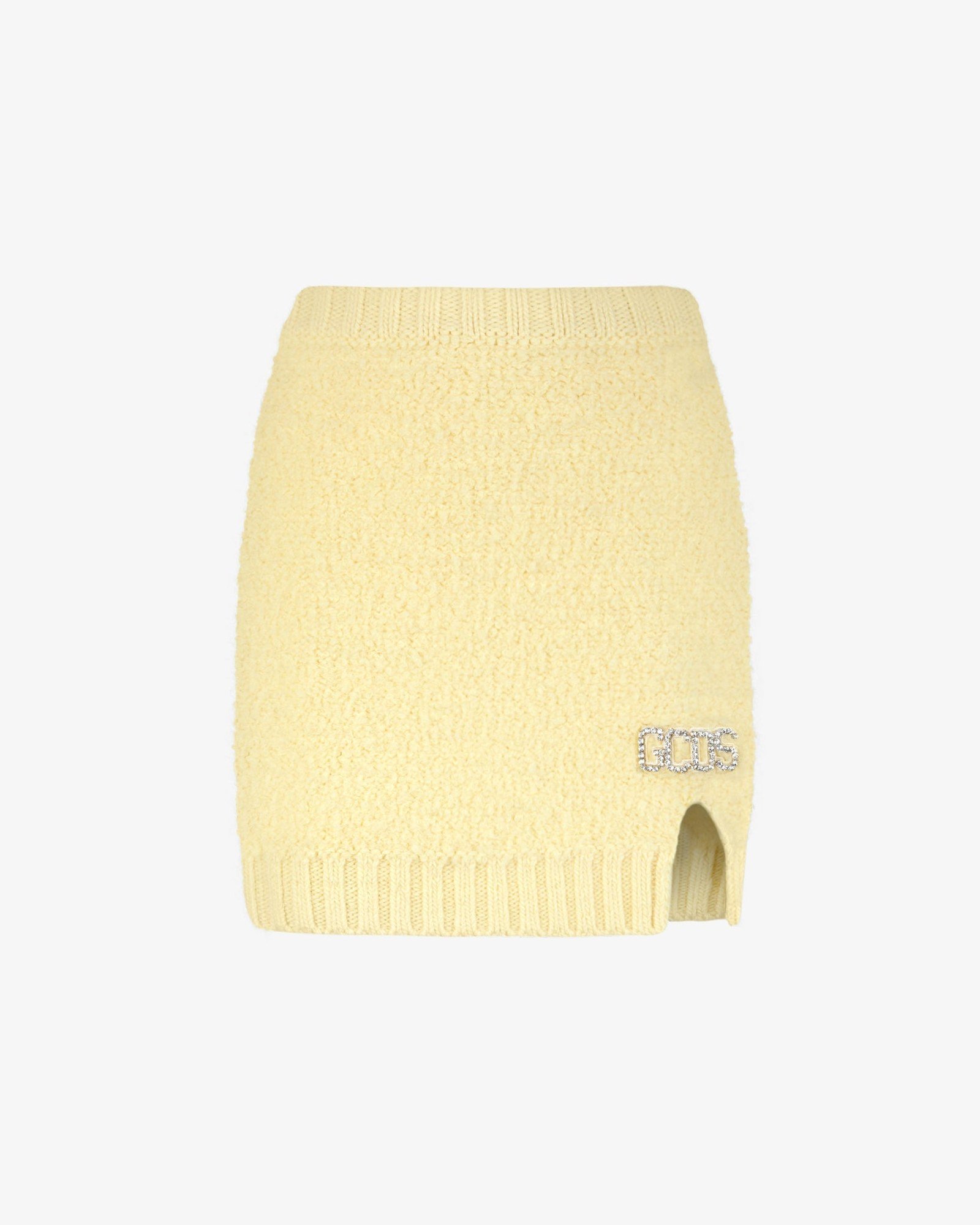 Опис: Міні-спідниця з м’якого букле із суміші вовни. Завершує одяг нашивка зі стразами GCDS і міні-розріз, обидва розміщені спереду. Зроблено в Італії.