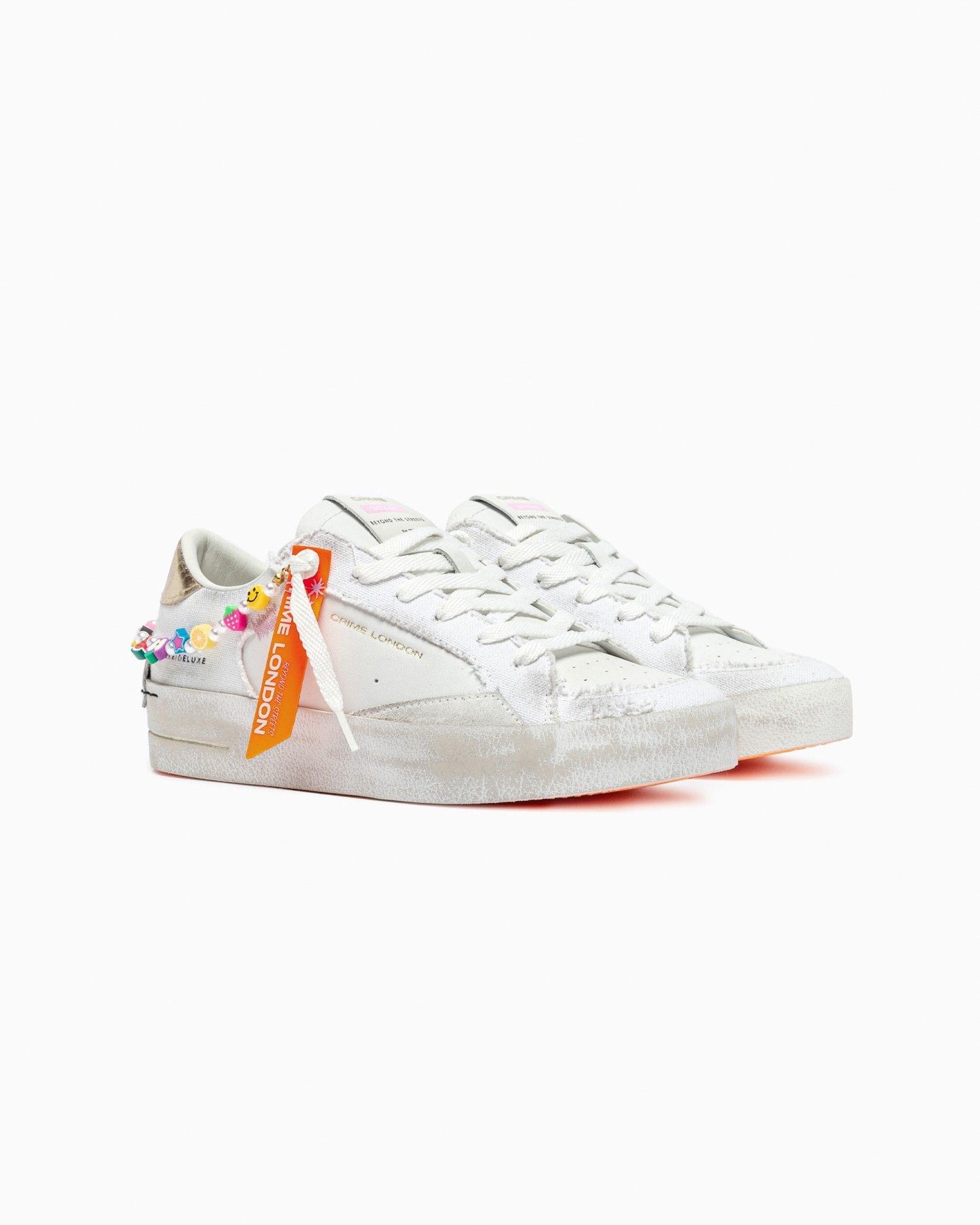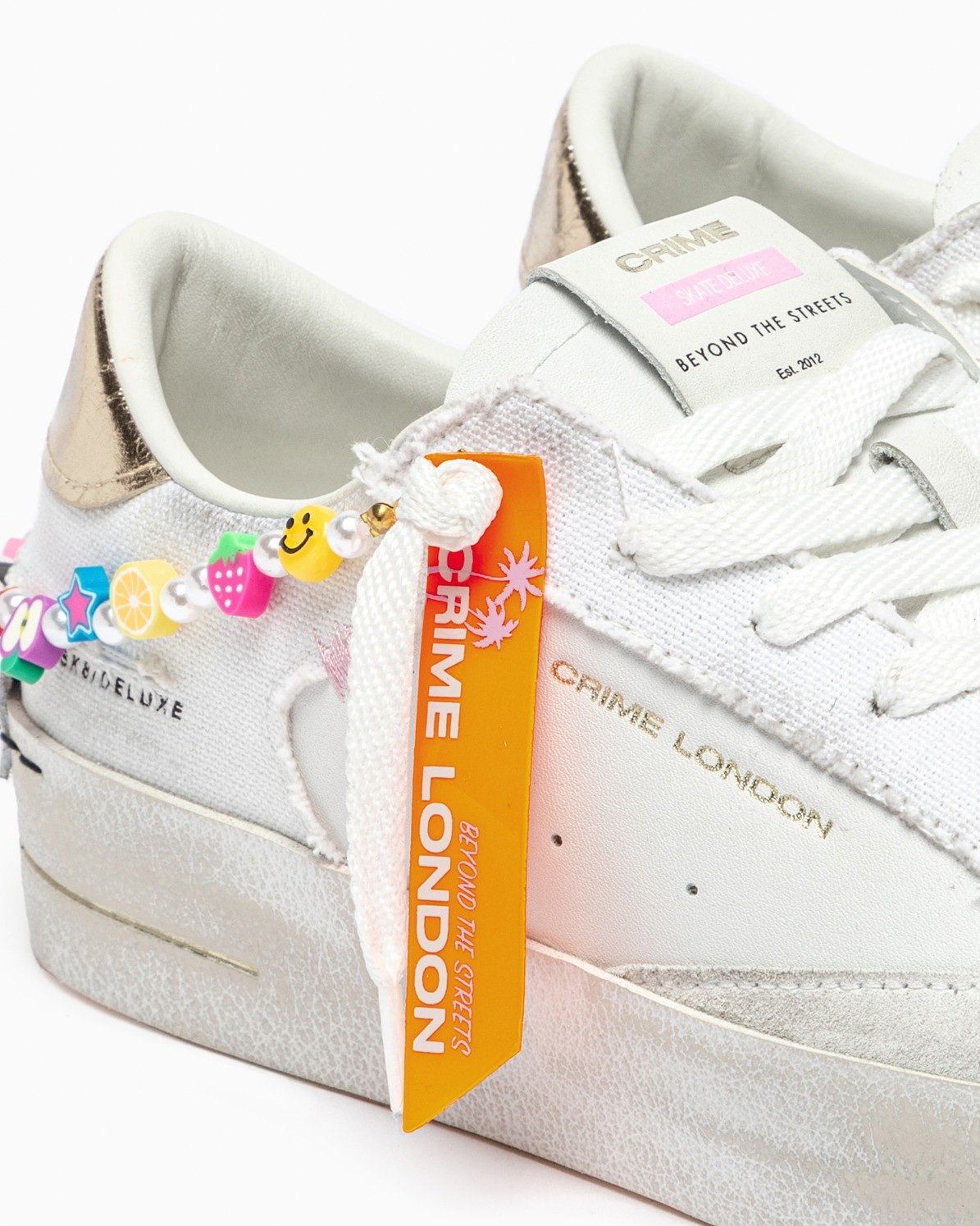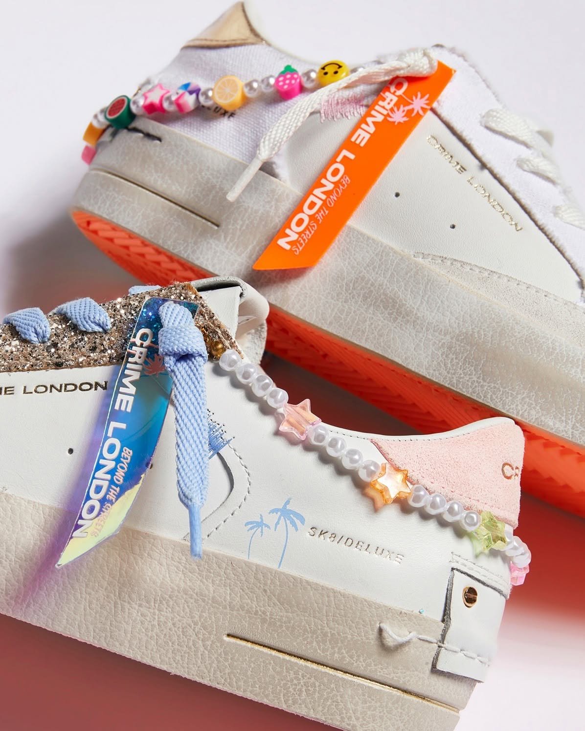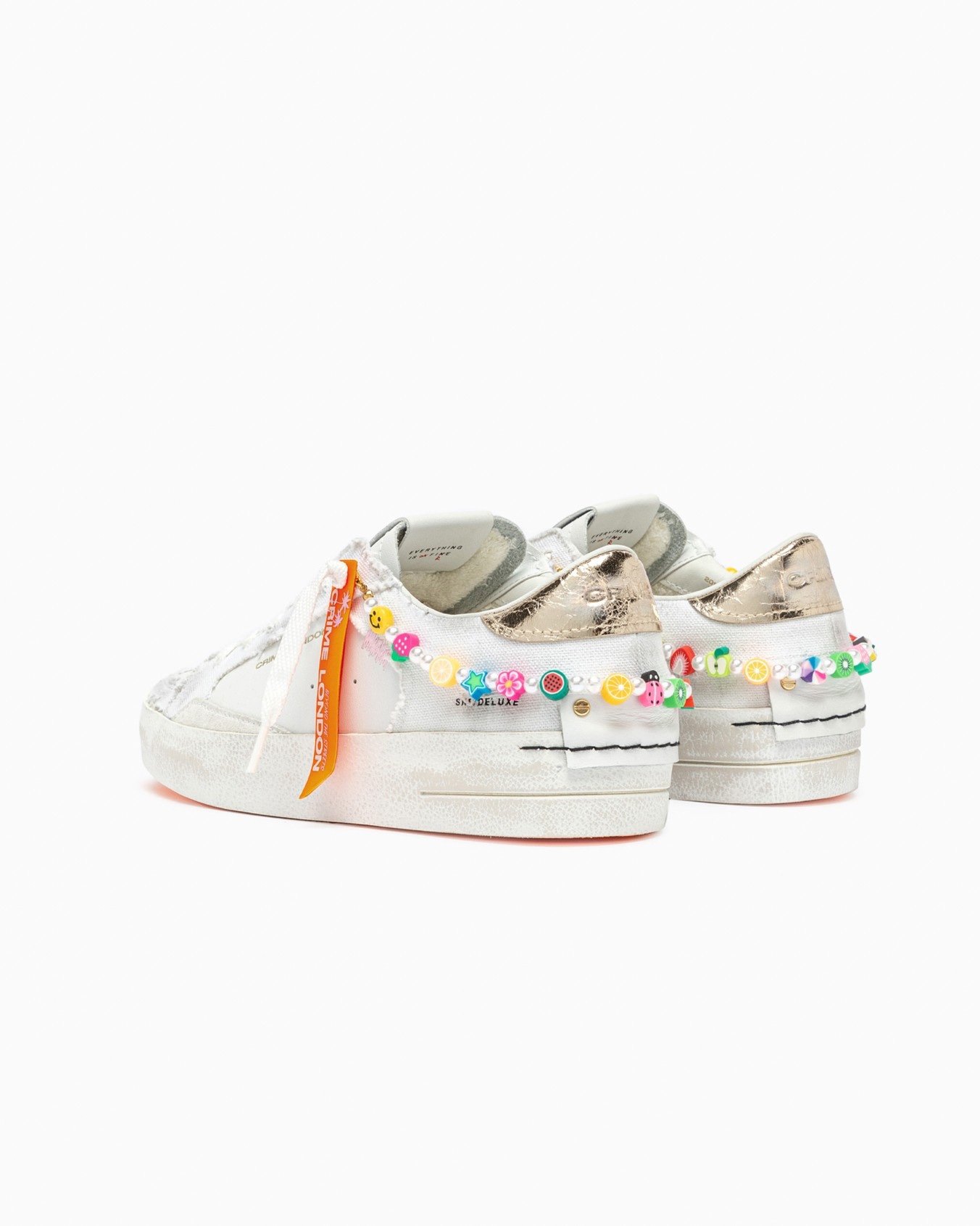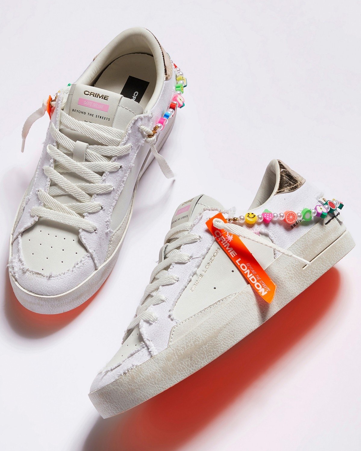 • Верх із білої шкіри та тканини з ланцюжком із бісеру та білими замшевими деталями