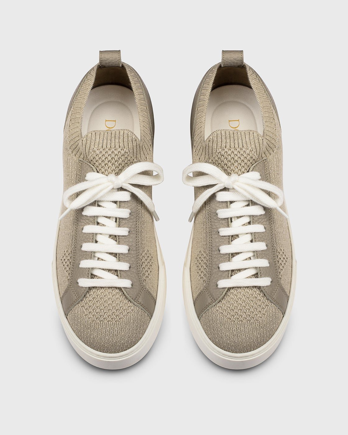 Кросівки з тканини та шкіри у кольорі тауп. Вишукані та невимушені, вони ідеально адаптуються до ноги завдяки еластичній вставці в області щиколотки.
