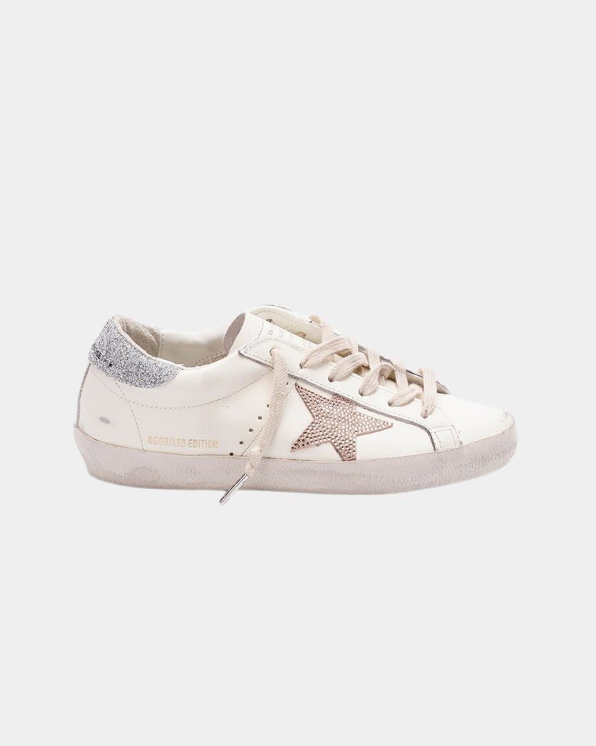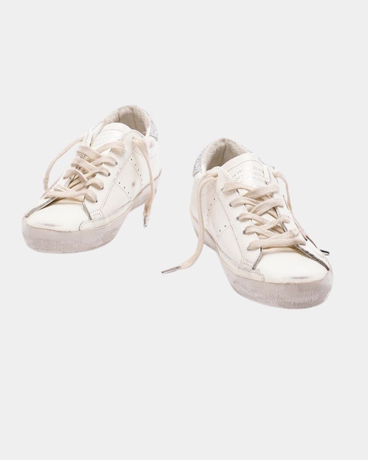 Білі кеди з ефектом потертості, сіра вставка ззаду, круглий носок, застібка на шнурівці, фірмовий знак на язичку, золота зірка збоку, логотип, гумова підошва.