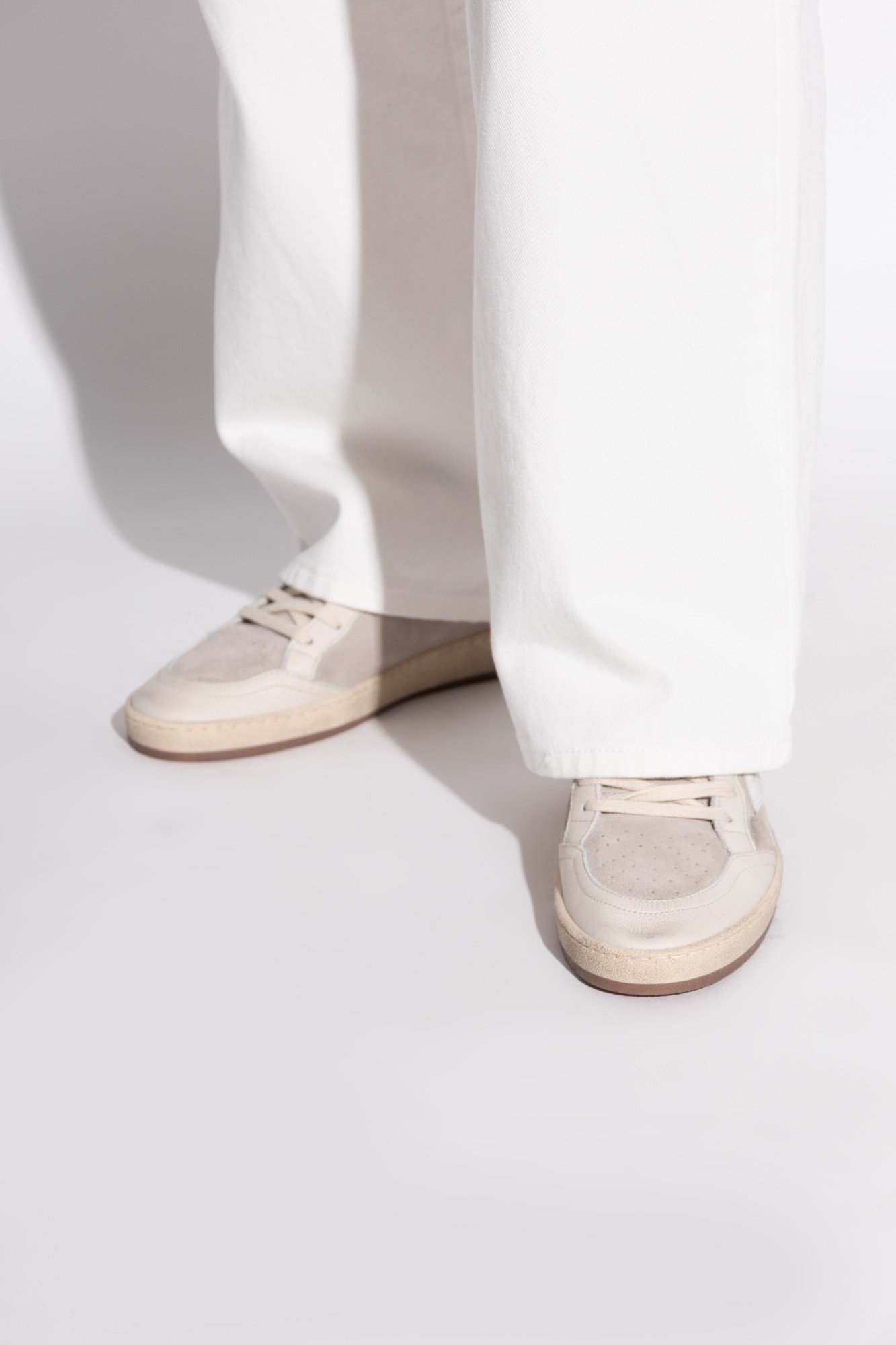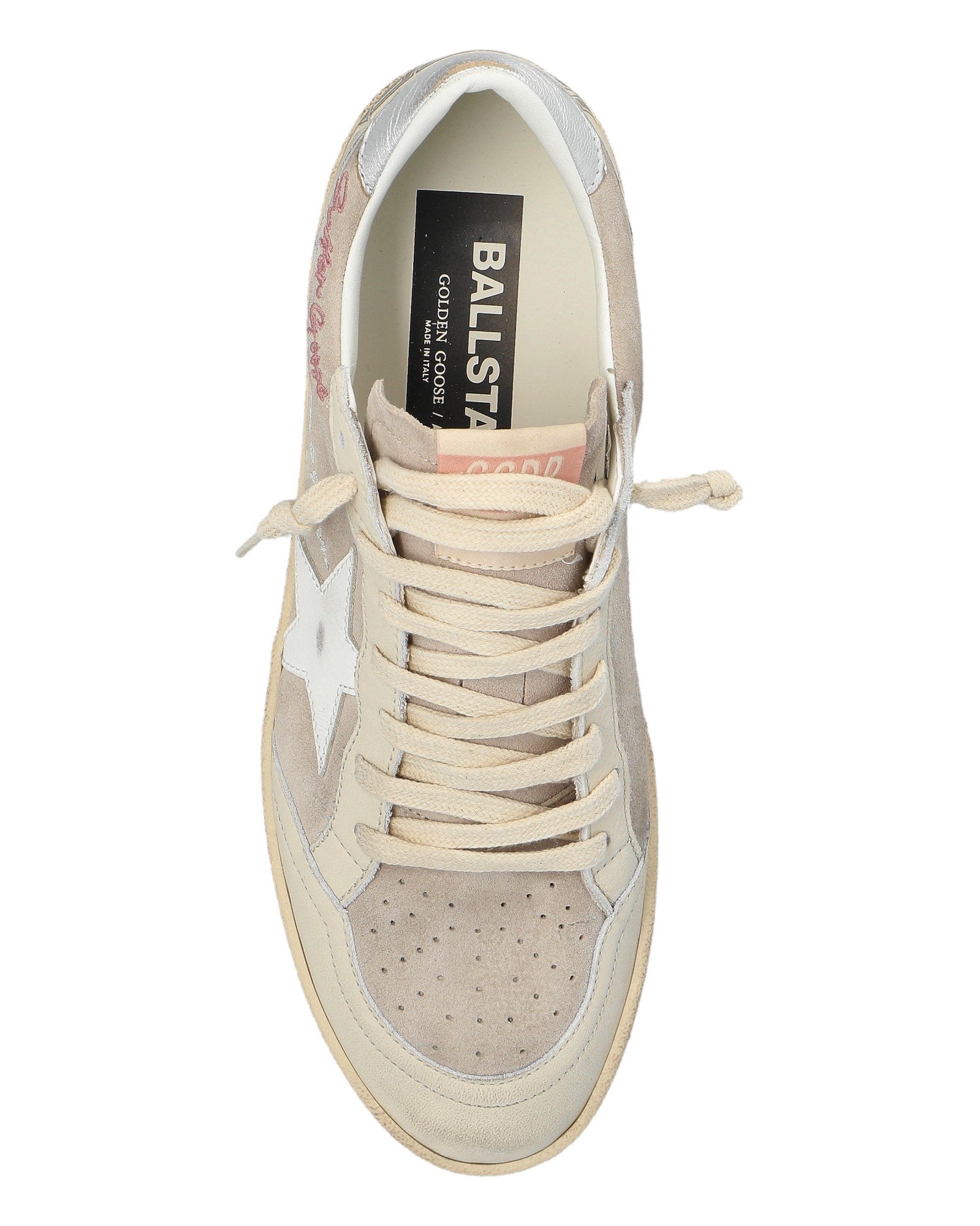 Кросівки Ball Star Sneakers, що втілюють розкішну елегантність і спортивний стиль, від престижного бренду Golden Goose. Ці виняткові кросівки, переважно кремового кольору з сірими акцентами, виготовлені з високоякісної шкіри та матеріалів, схожих на замшу.