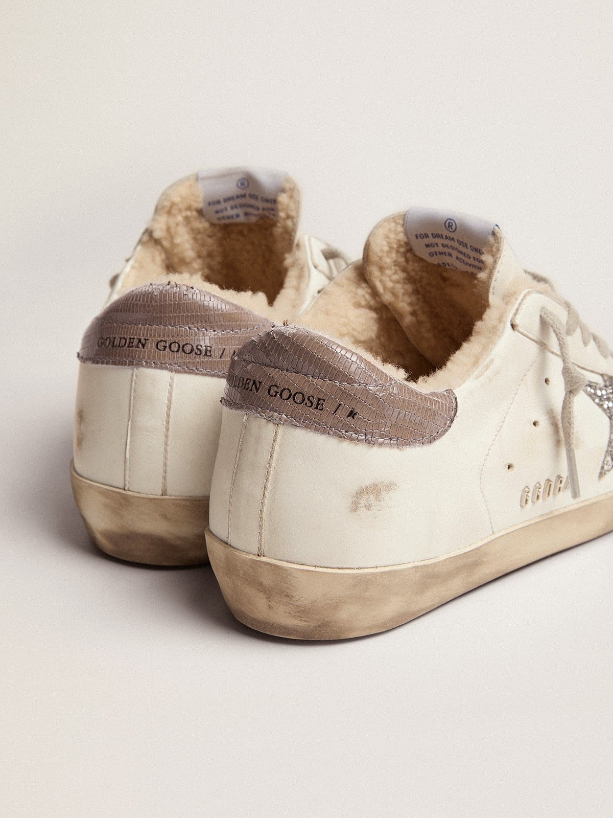 Ці кросівки Super-Star, підбиті м’якою овчиною, мають білий шкіряний верх, підкреслений срібною блискучою зіркою, та шкіряну вставку кольору голубини сірої п’яти з принтом ящірки. Гальванічно-срібний металевий напис GGDB та крижано-сірі шнурки додають завершальний штрих.
