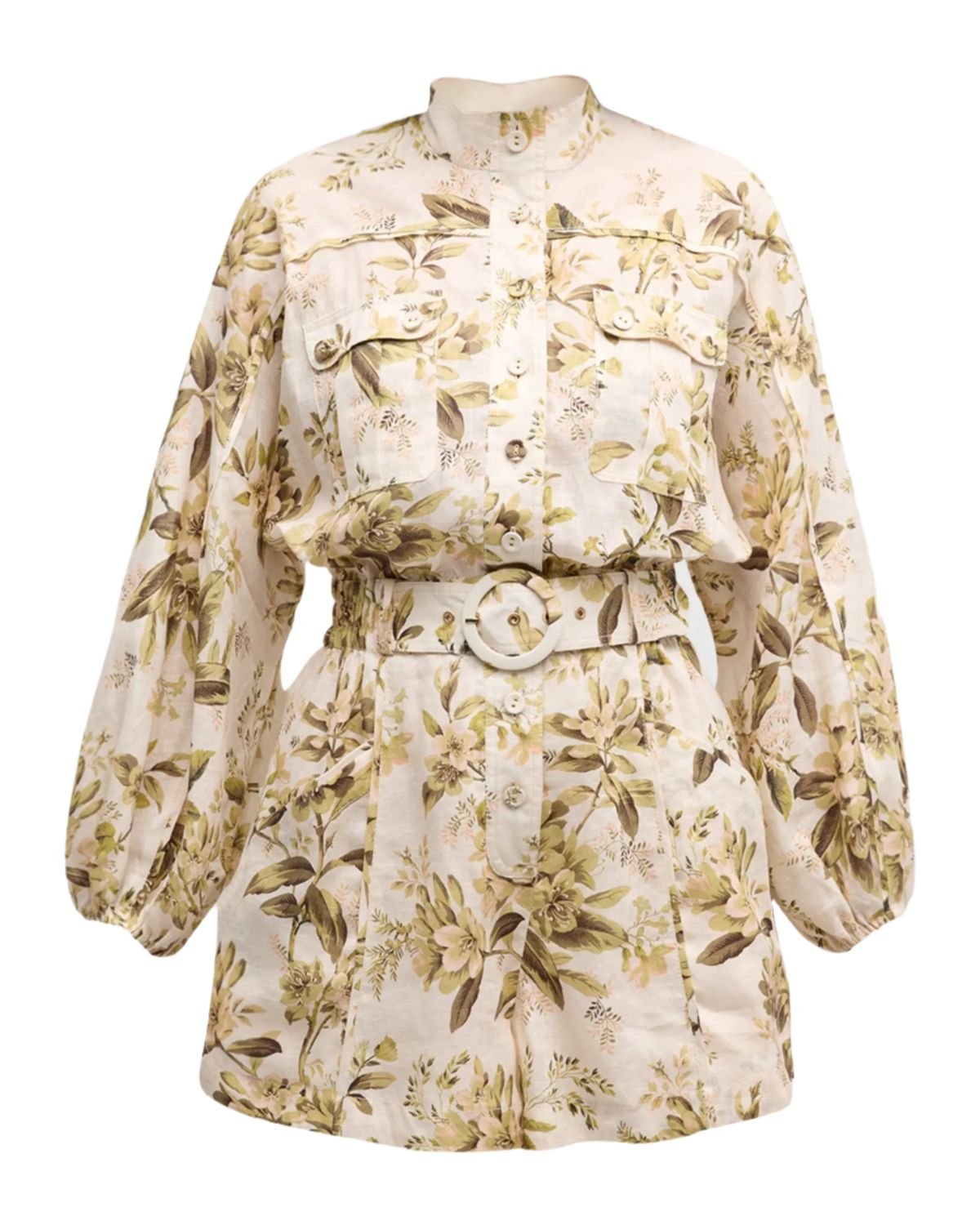 Комбінезон із золотистими панелями від Zimmermann із застібкою на ґудзиках, коміром-стійкою, довгими рукавами з еластичними манжетами та поясом на талії. Розслаблений крій.