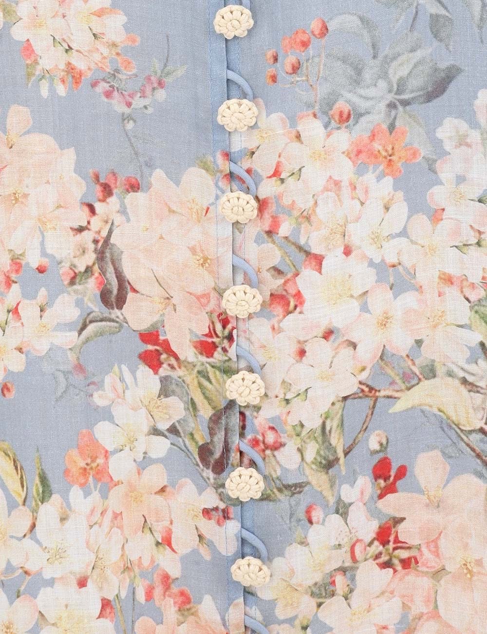 Блузка Cascadian Billow кольору Teal Blue з ботанічним квітковим принтом з колекції літніх купальних костюмів 2025. Блузка з рамі з коміром-стійкою, довгими рукавами з еластичними манжетами та центральними ґудзиками спереду, оздоблена фестончатою мереживною обробкою.