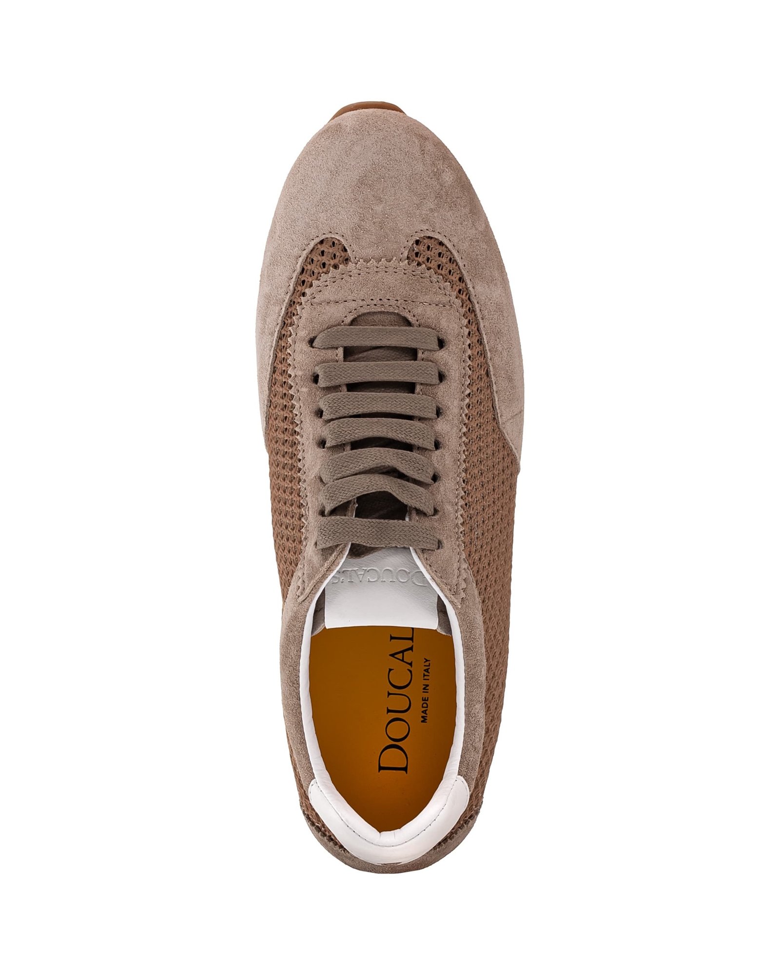 Комбіновані кросівки із замшевої шкіри та сітчастого текстилю. Мигдалеподібний мис, шнурівка спереду, шкіряна нашивка з тисненим логотипом бренду на язичку, ребриста підошва.
