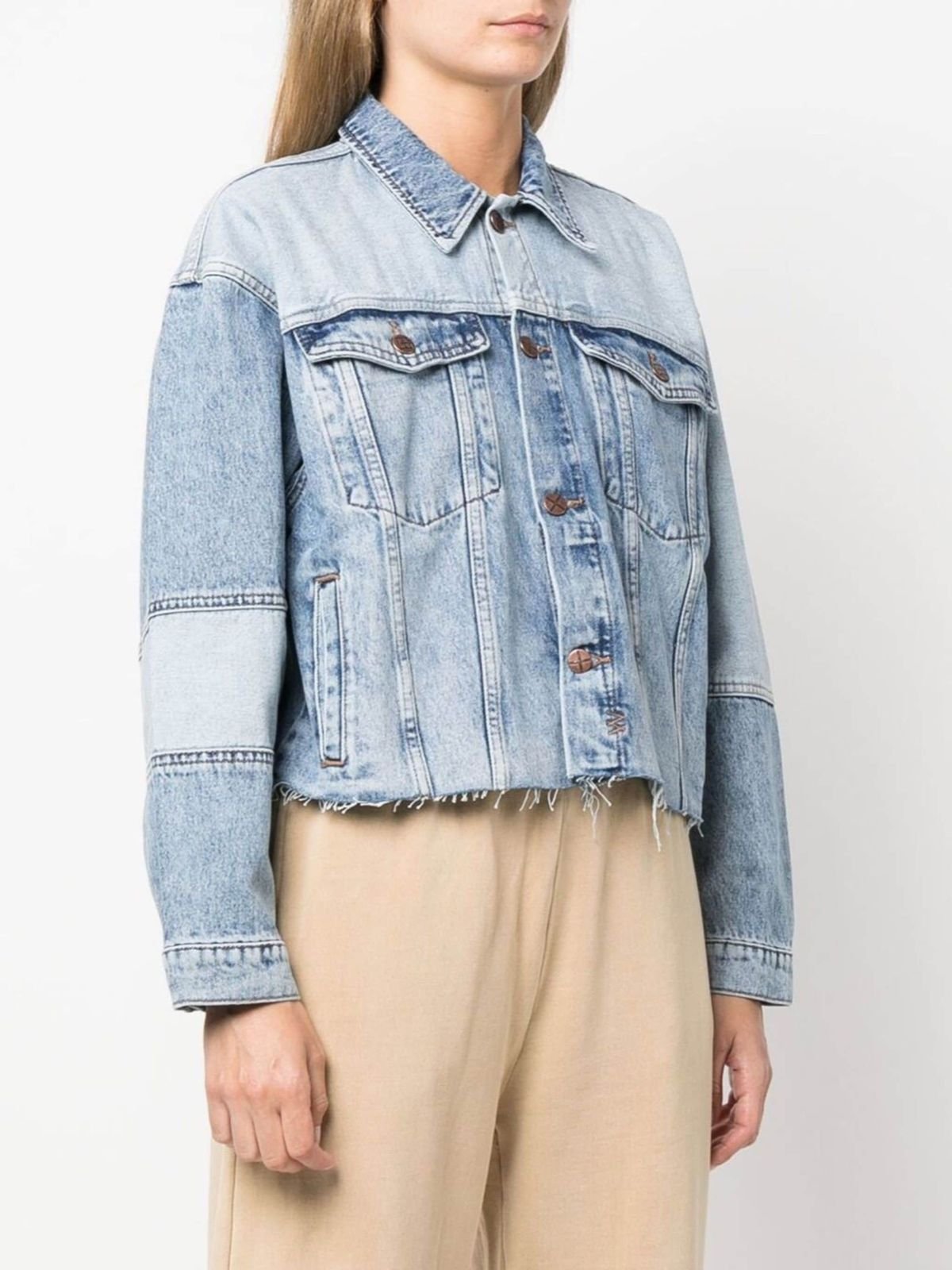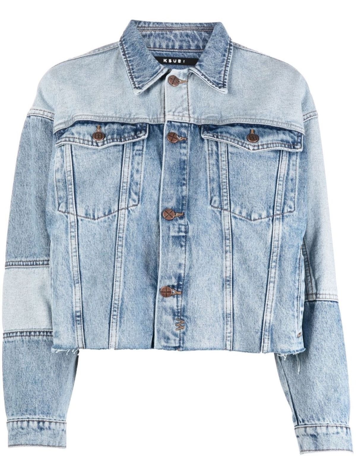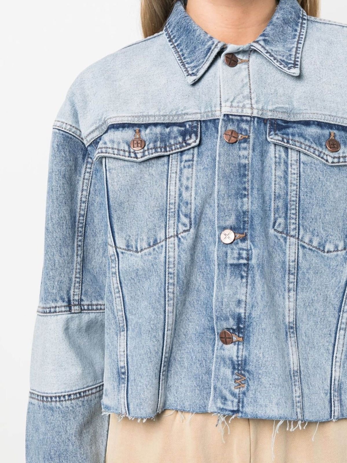 світло-блакитний/темно-синій бавовняний клаптевий дизайн, прямий комір, застібка на ґудзиках спереду, довгі рукави, манжети на ґудзиках, дві нагрудні накладні кишені, дві бічні прорізні кишені, прямий низ.