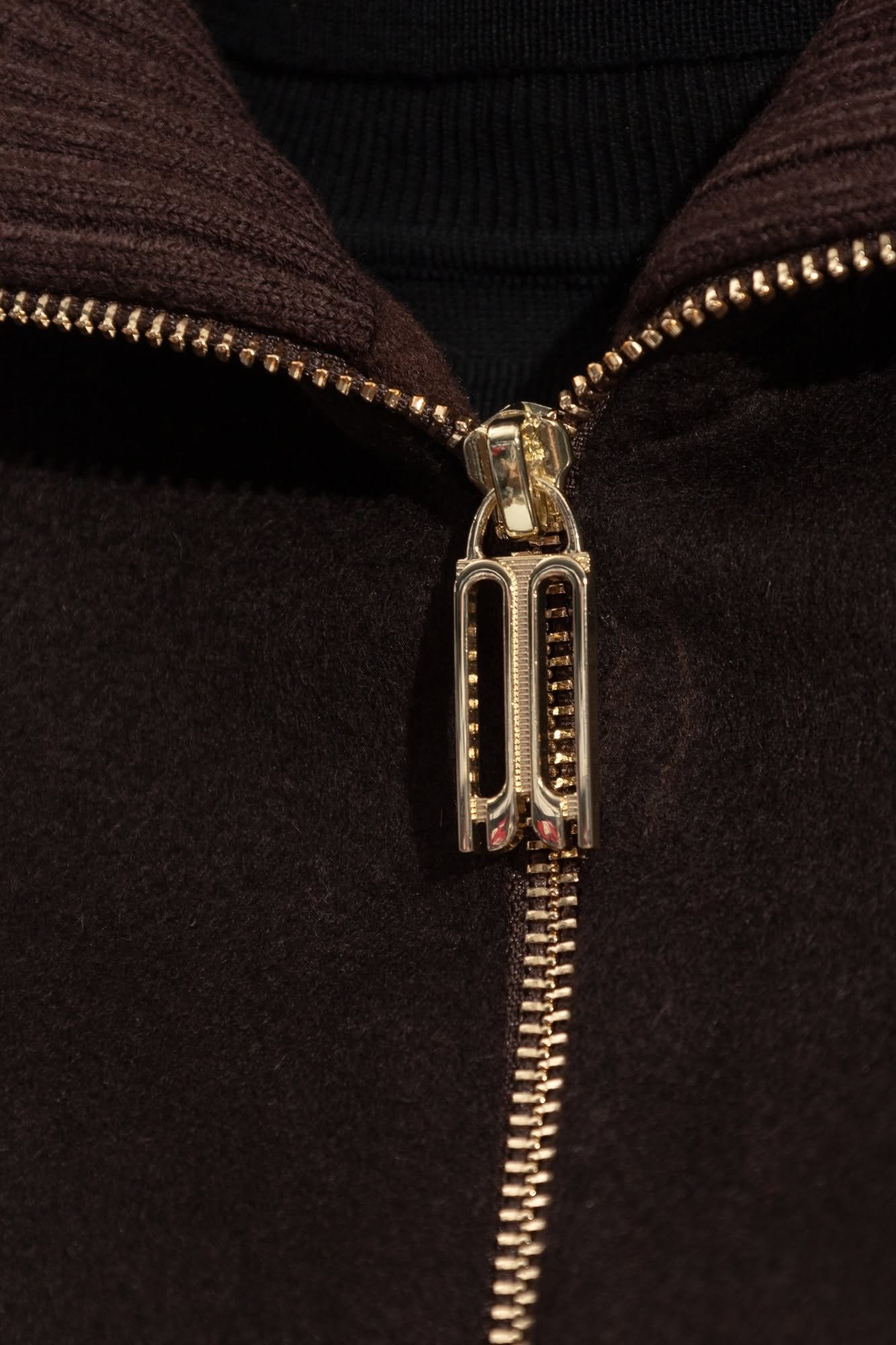 Гармонійне поєднання в'язаної ребристої обробки на манжетах та подолу надає всьому виробу вишуканої легкості. Золота двостороння блискавка привертає увагу, слугуючи одночасно яскравим візуальним та функціональним елементом. Дискретні, похилі кишені доповнюють образ – куртка залишається гармонійною та позачасовою, без зайвих прикрас чи видимих логотипів.
