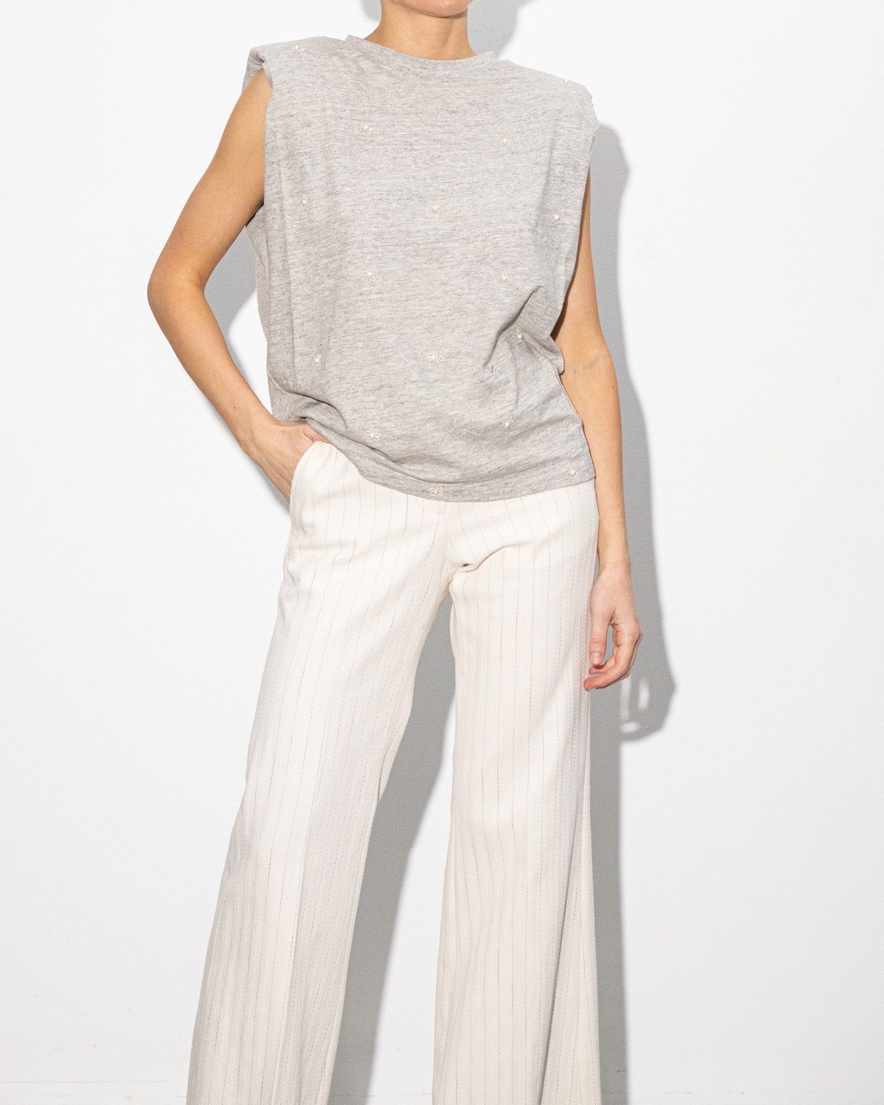 Цей стиль без рукавів зі старого білого бавовняного трикотажу має укорочений крій. Крім того, він прикрашений каскадом перлів спереду. Як останній штрих, плечі з м’якою підкладкою нагадують про одну з емблем – піджак, пошитий на замовлення.