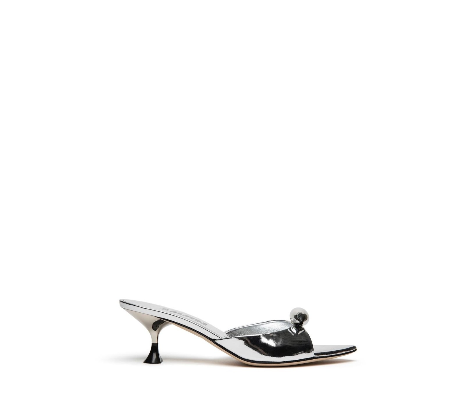 Дзеркальні шкіряні мюлі з аксесуаром у формі черепашки на двоколірному рельєфному каблуці. Модель Nora має нотку гламуру та комфорту, підкресленого аксесуаром та каблуком.