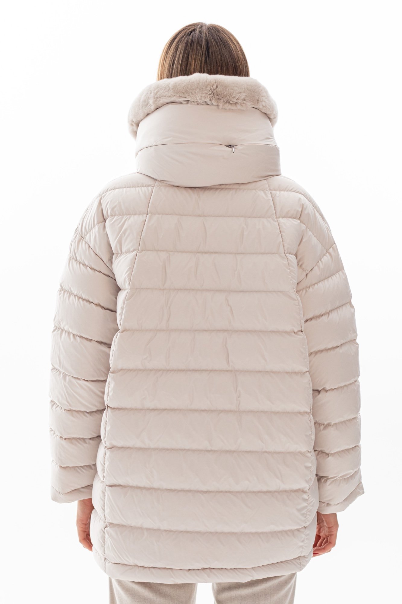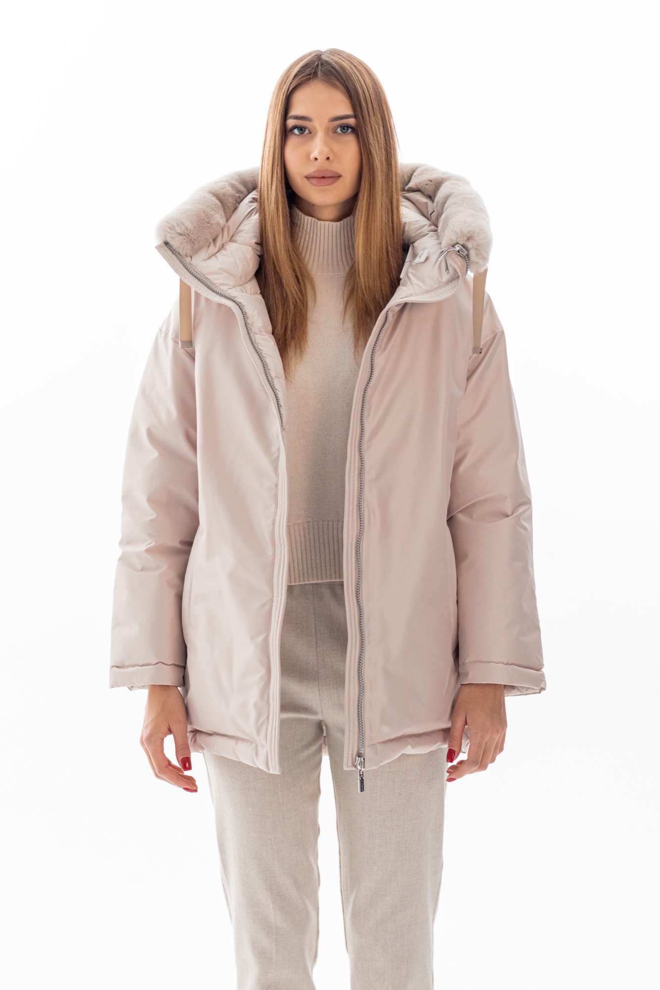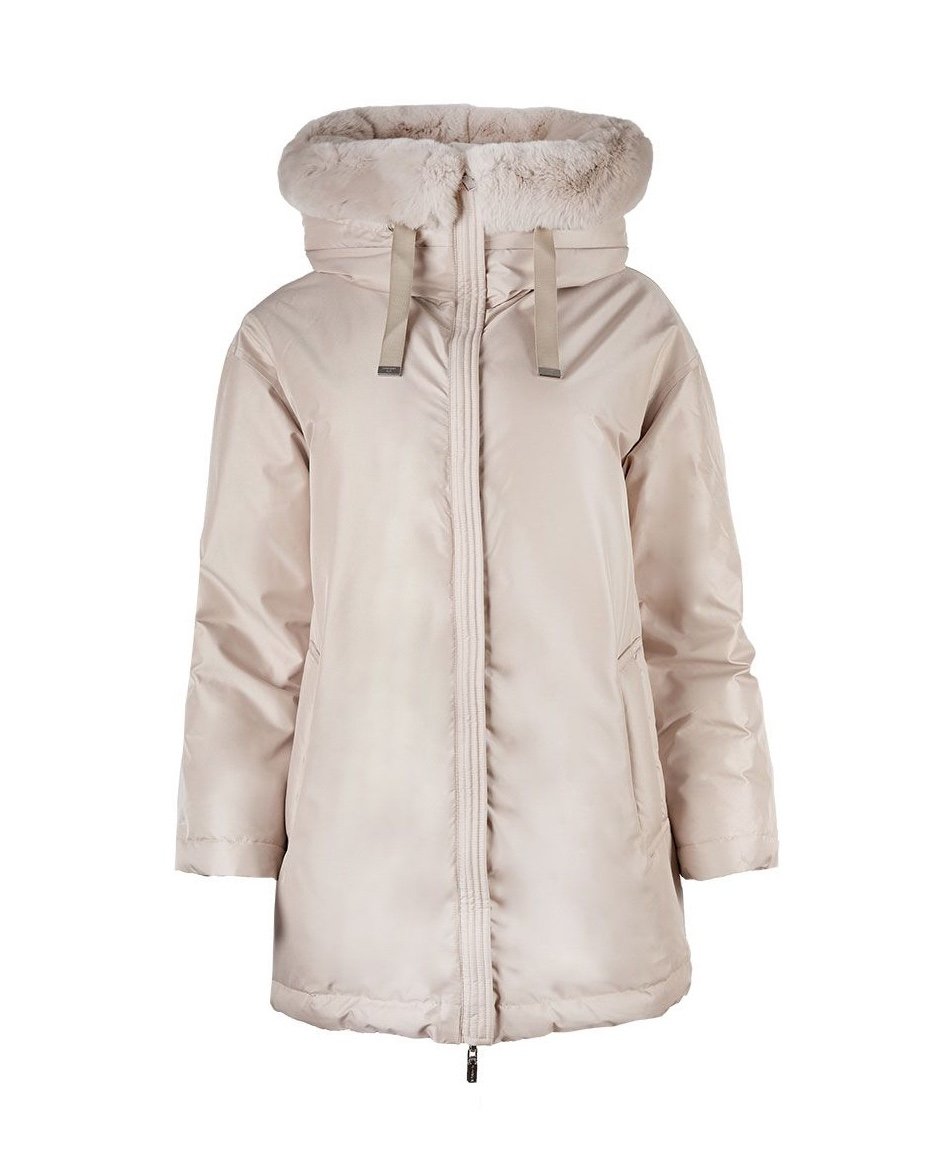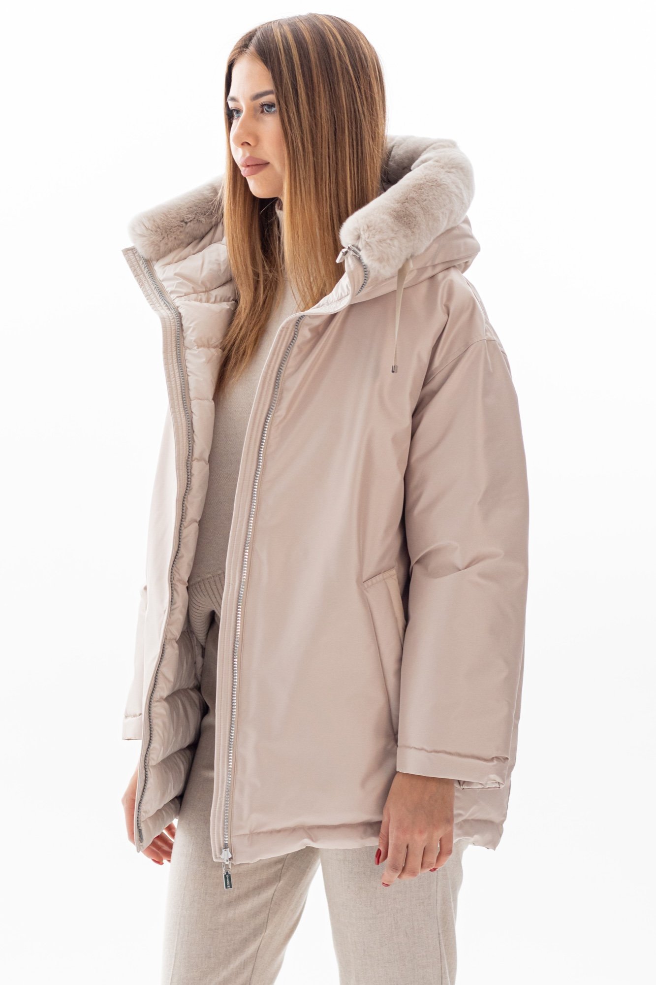 Двосторонній пуховик прямого силуету з гладкою та стьобаною сторонами. Застібається на блискавку та має бічні врізні кишені. Завдяки водовідштовхувальному просоченню та високоякісному пуховому наповнювачу, він надійно захищає від холоду та вологи. Капюшон оброблений хутром кролика рекс, глибину якого можна регулювати за допомогою блискавки. Хутро підібрано в тон пуховика, що надає йому стильного вигляду, що запам'ятовується.