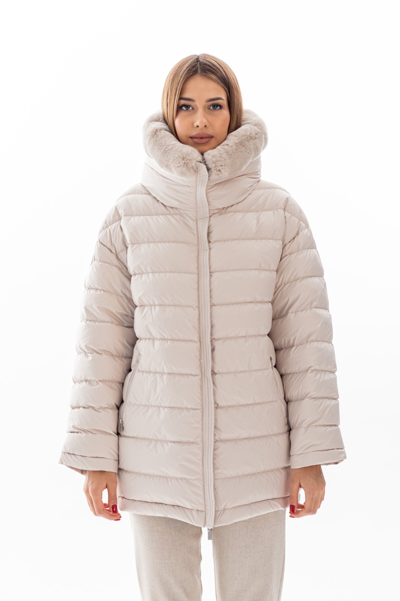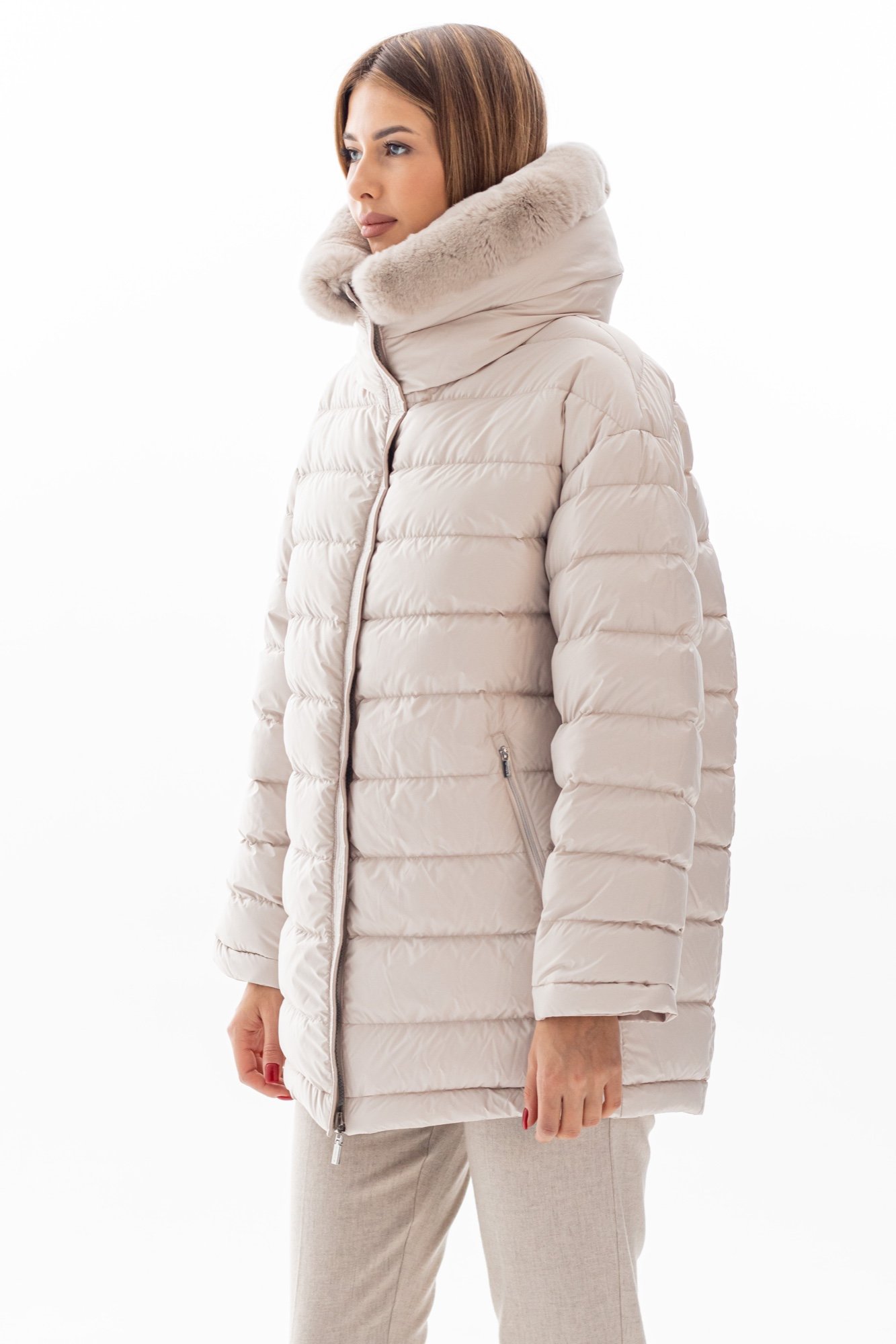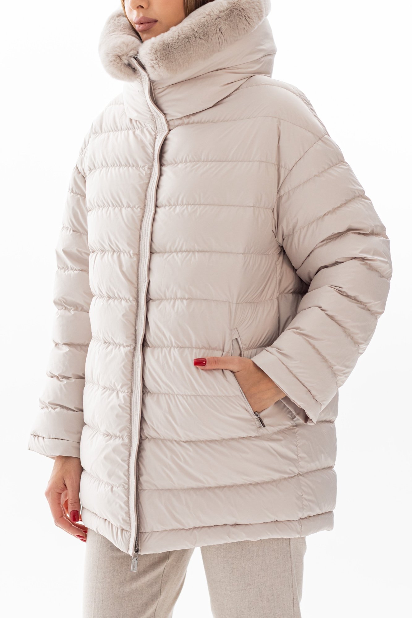 Двосторонній пуховик прямого силуету з гладкою та стьобаною сторонами. Застібається на блискавку та має бічні врізні кишені. Завдяки водовідштовхувальному просоченню та високоякісному пуховому наповнювачу, він надійно захищає від холоду та вологи. Капюшон оброблений хутром кролика рекс, глибину якого можна регулювати за допомогою блискавки. Хутро підібрано в тон пуховика, що надає йому стильного вигляду, що запам'ятовується.