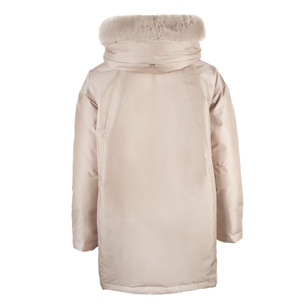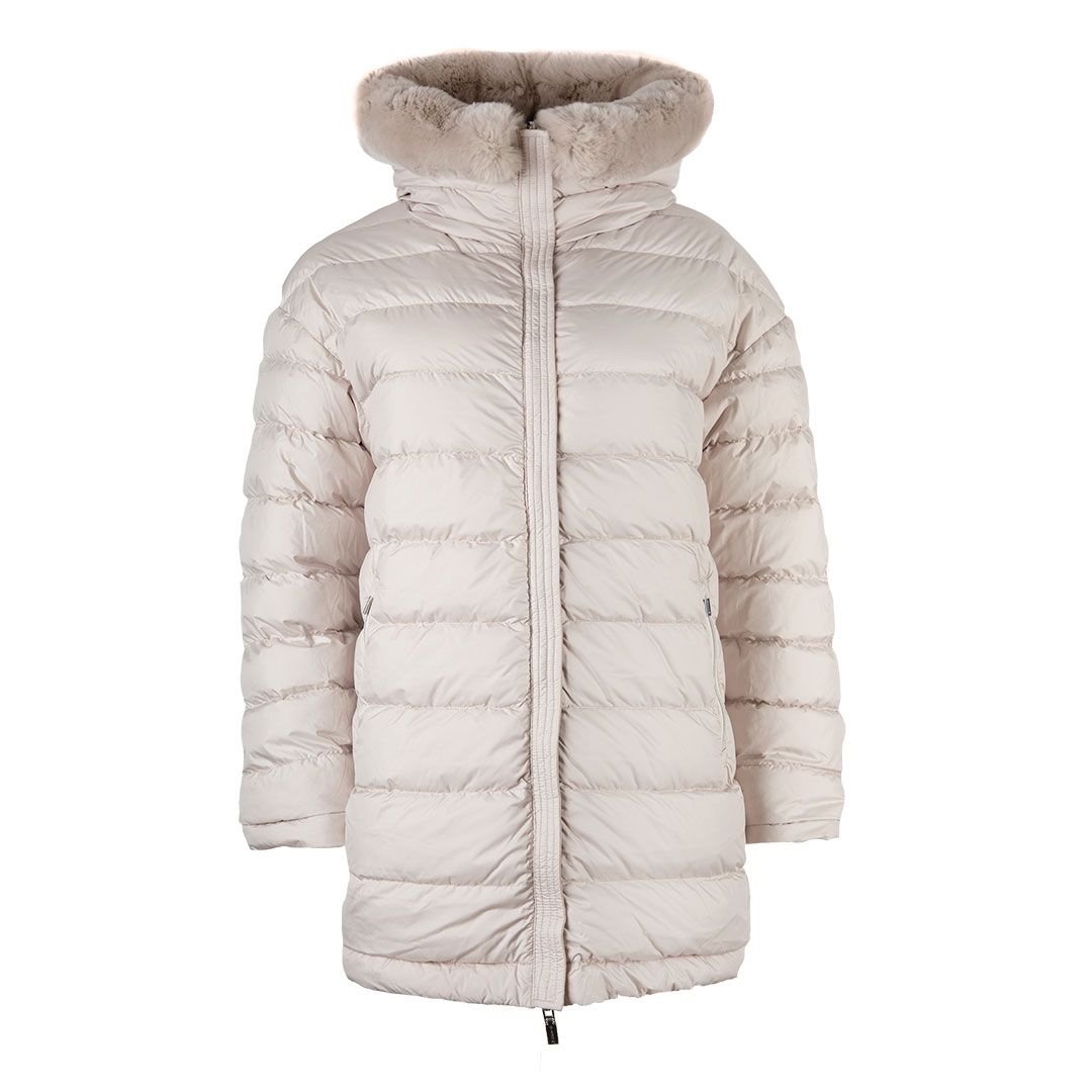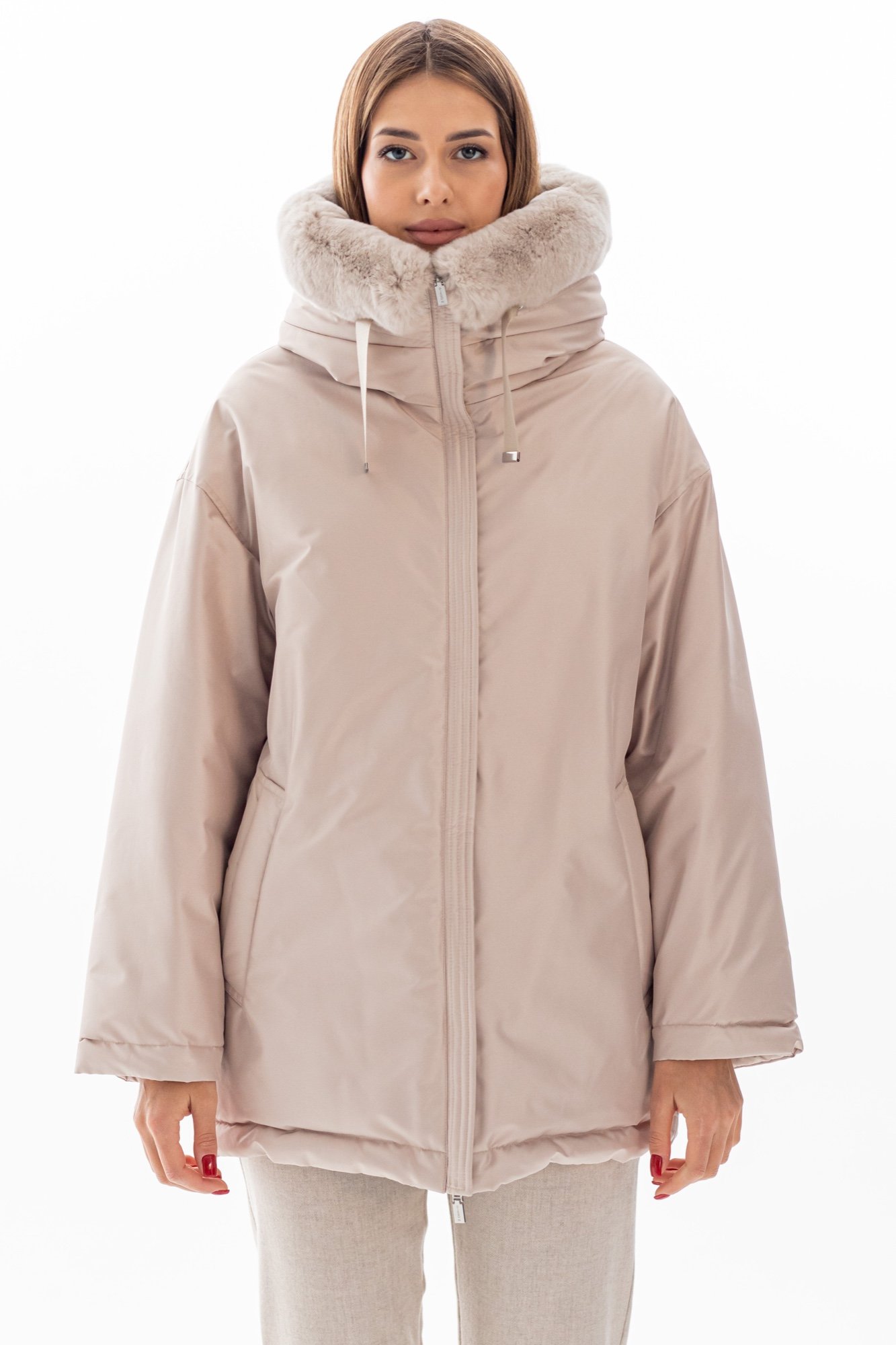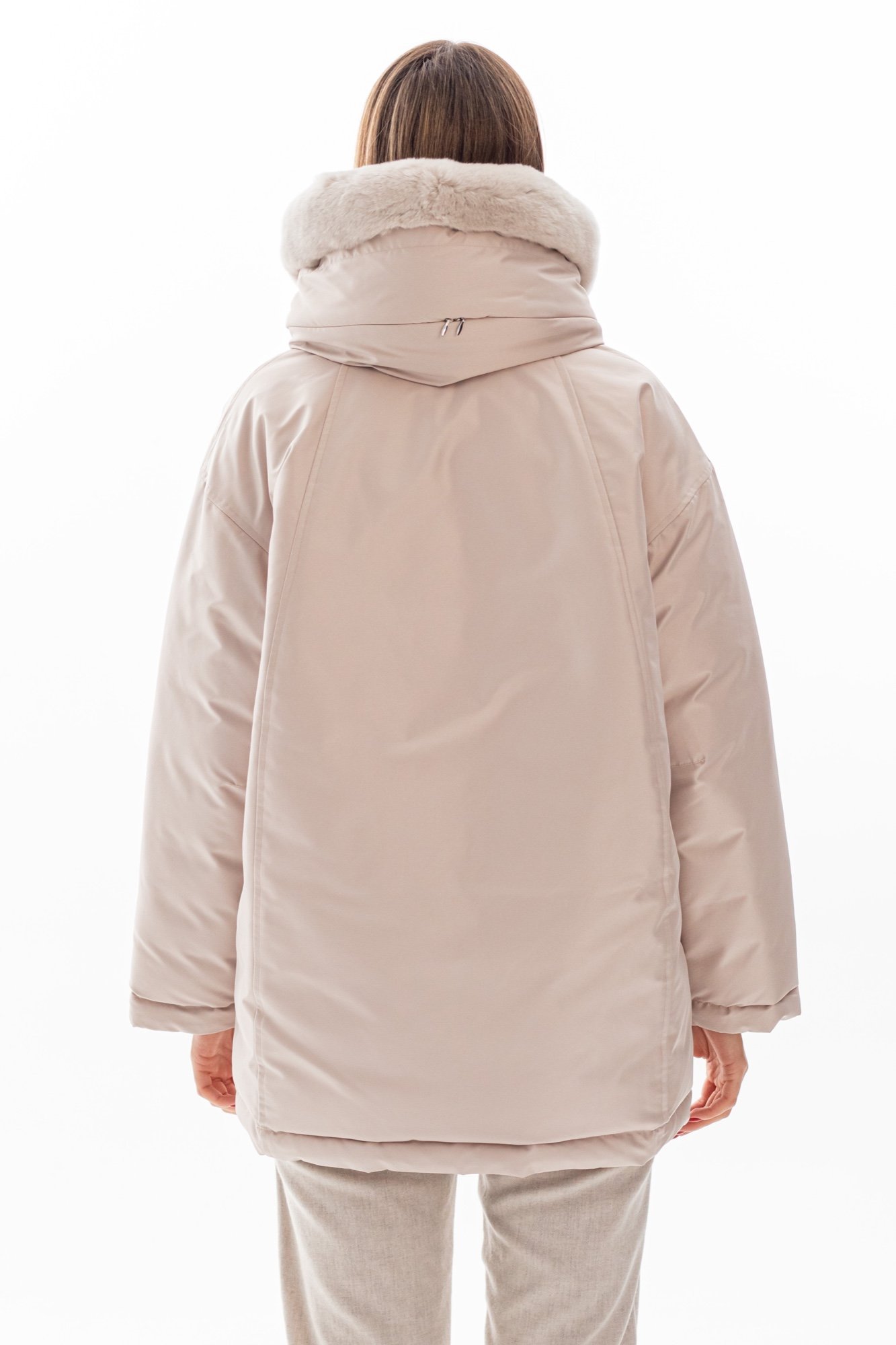 Двосторонній пуховик прямого силуету з гладкою та стьобаною сторонами. Застібається на блискавку та має бічні врізні кишені. Завдяки водовідштовхувальному просоченню та високоякісному пуховому наповнювачу, він надійно захищає від холоду та вологи. Капюшон оброблений хутром кролика рекс, глибину якого можна регулювати за допомогою блискавки. Хутро підібрано в тон пуховика, що надає йому стильного вигляду, що запам'ятовується.