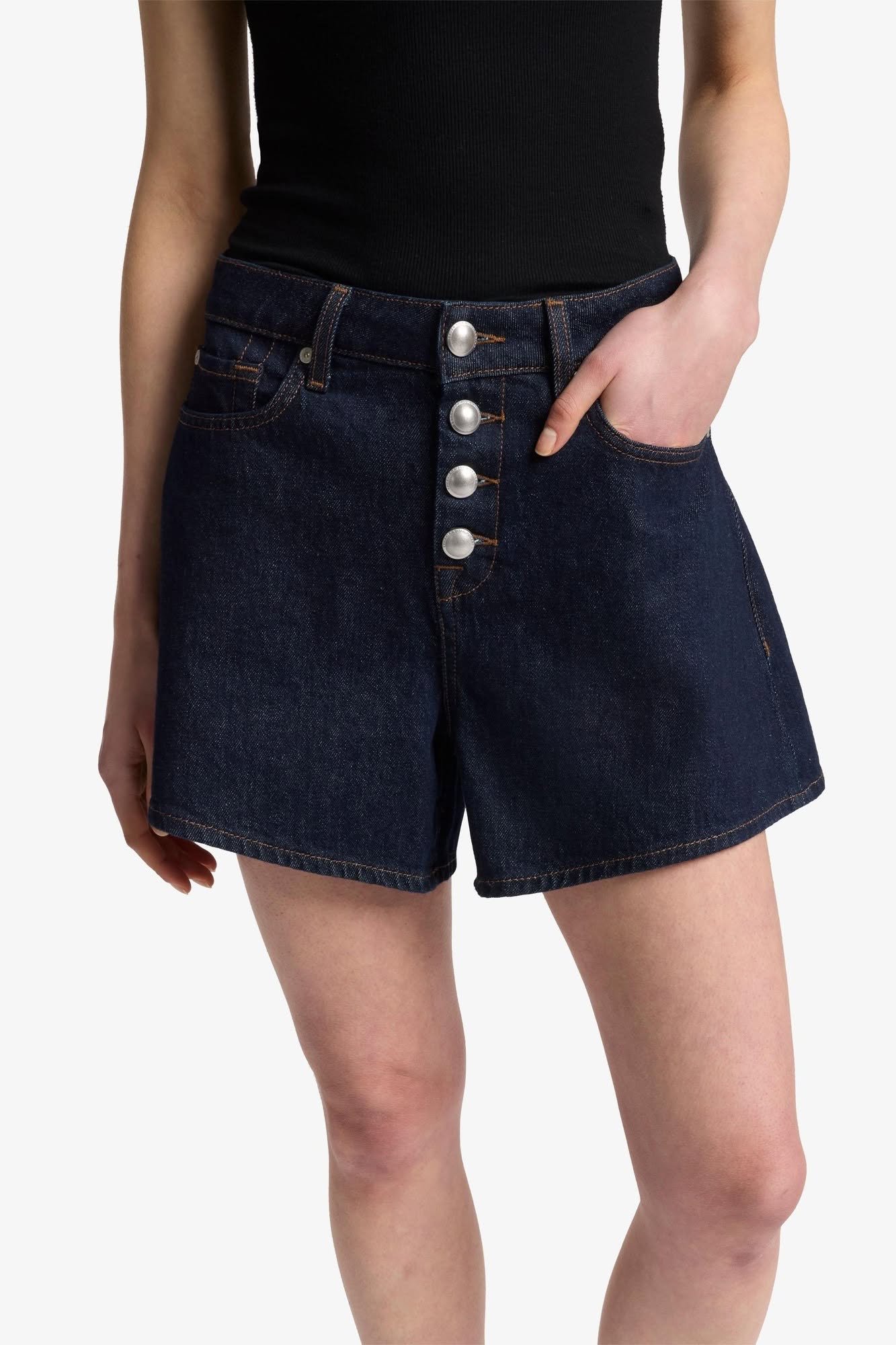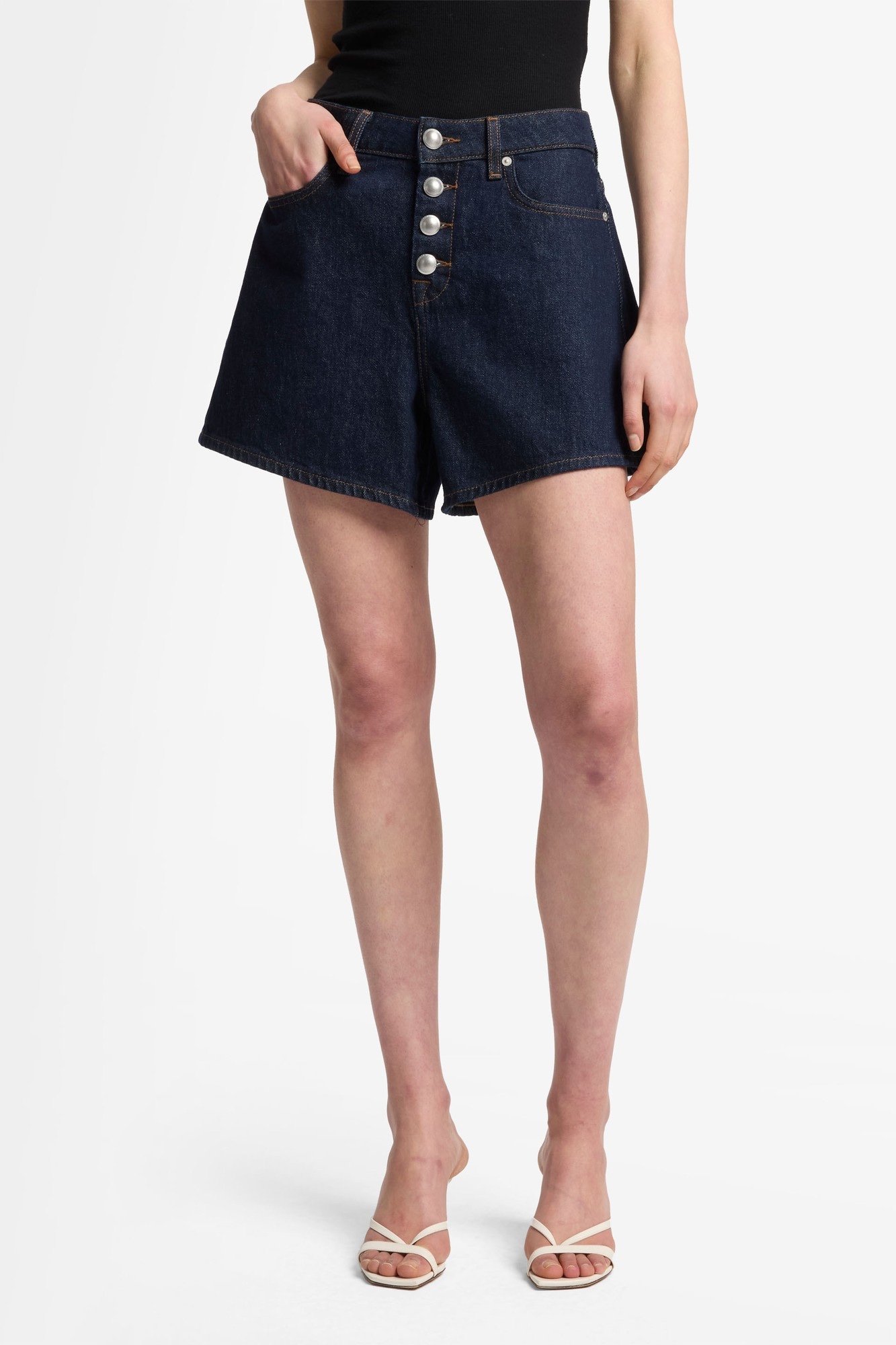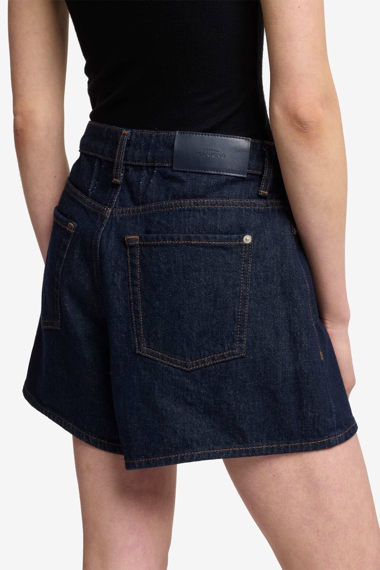 Шорти Kori з деніму Mankind глибокого індиго-полірування мають гарний структурований силует. Цей напрямлений стиль має високу талію та розкльошені штанини, що створює сміливий образ. Нам подобаються срібні ґудзики та деталі тютюнового кольору. Носіть їх з піджаком, що пасує до нього, та гостроносими босоніжками-ремінцями для безтурботного та вишуканого образу.