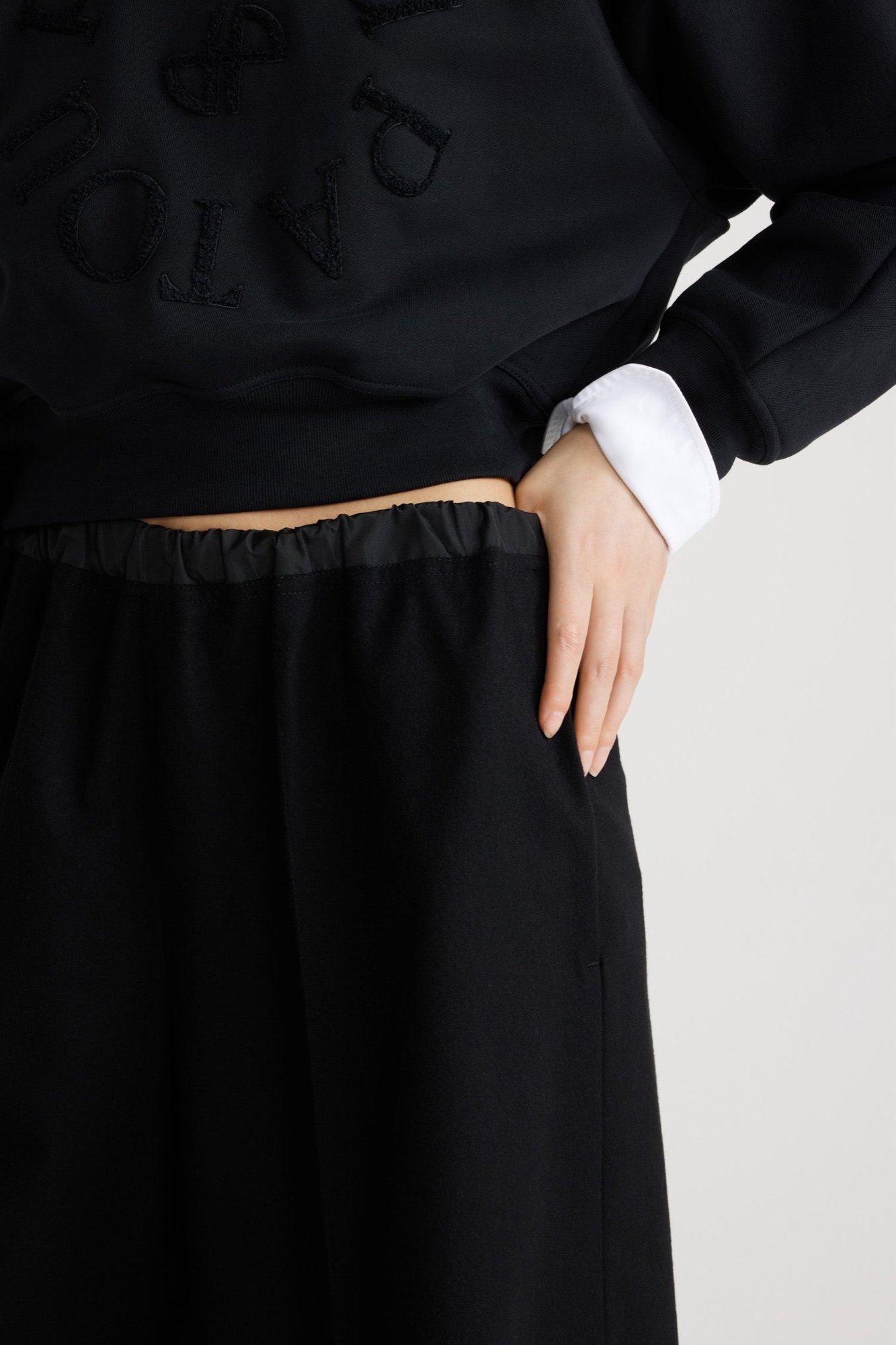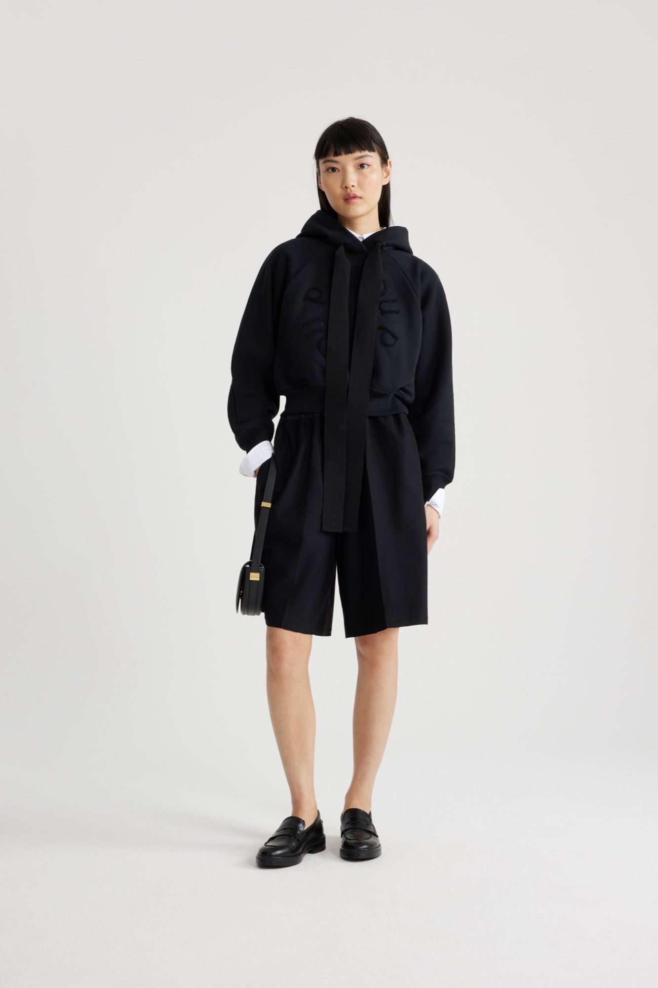 Чорні фланелеві шорти з екологічно чистої суміші вовни. Довжина до коліна. Резинка на талії. Контрастний пояс. Дві кишені з боків. Запрасовані складки спереду.