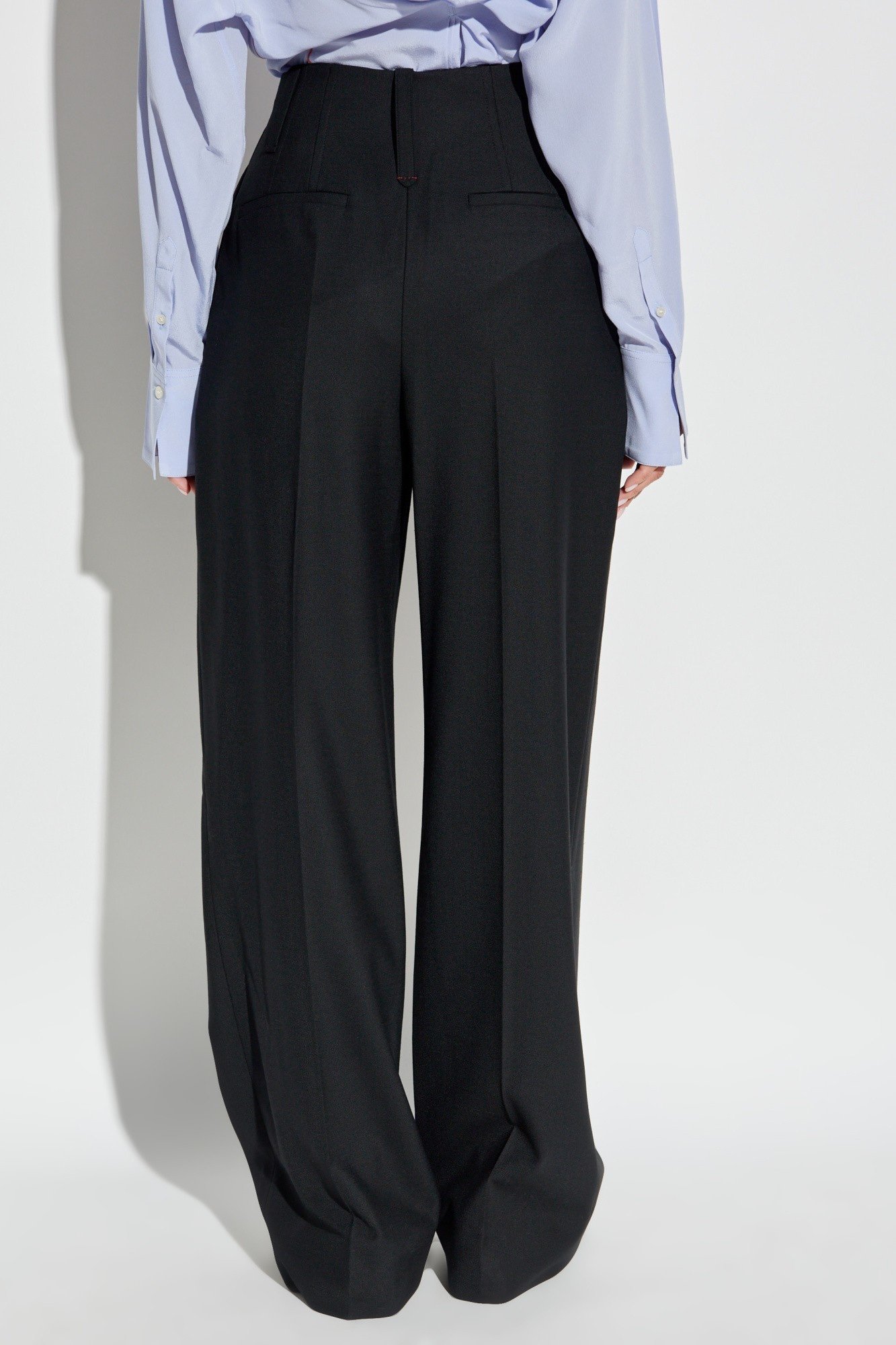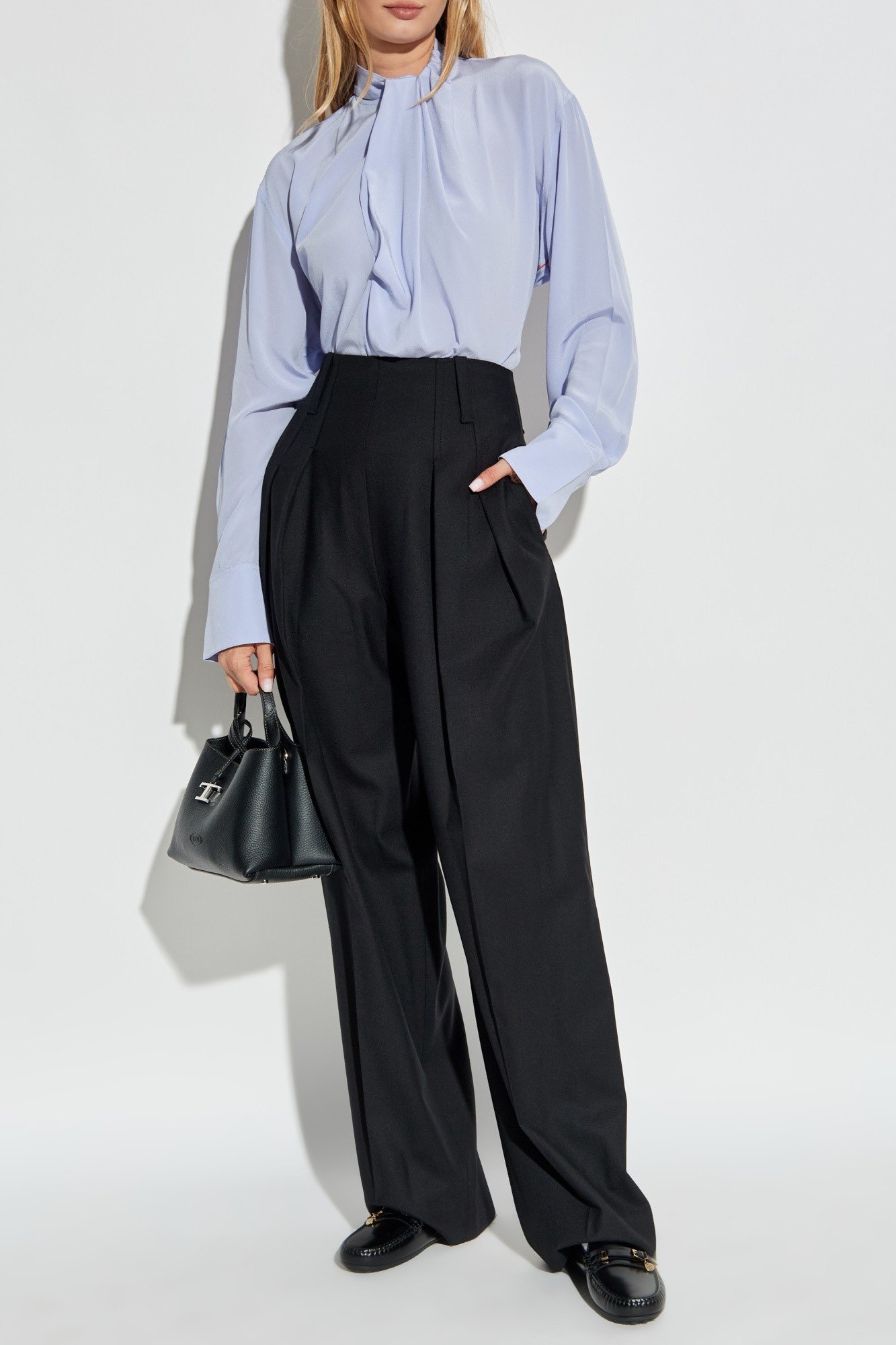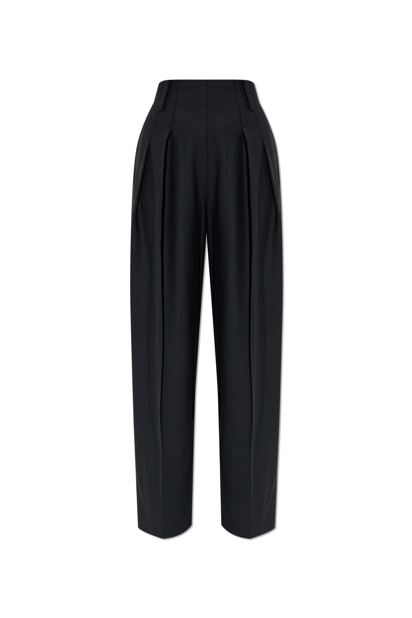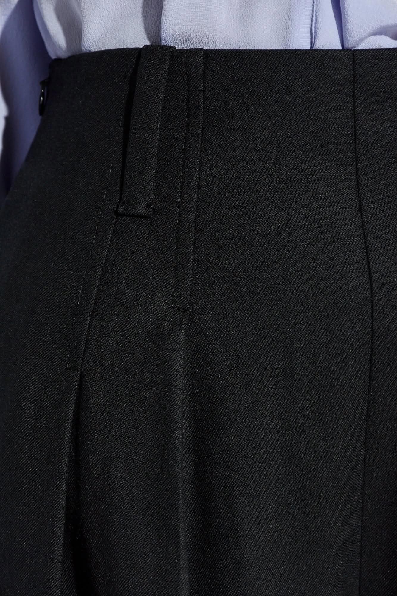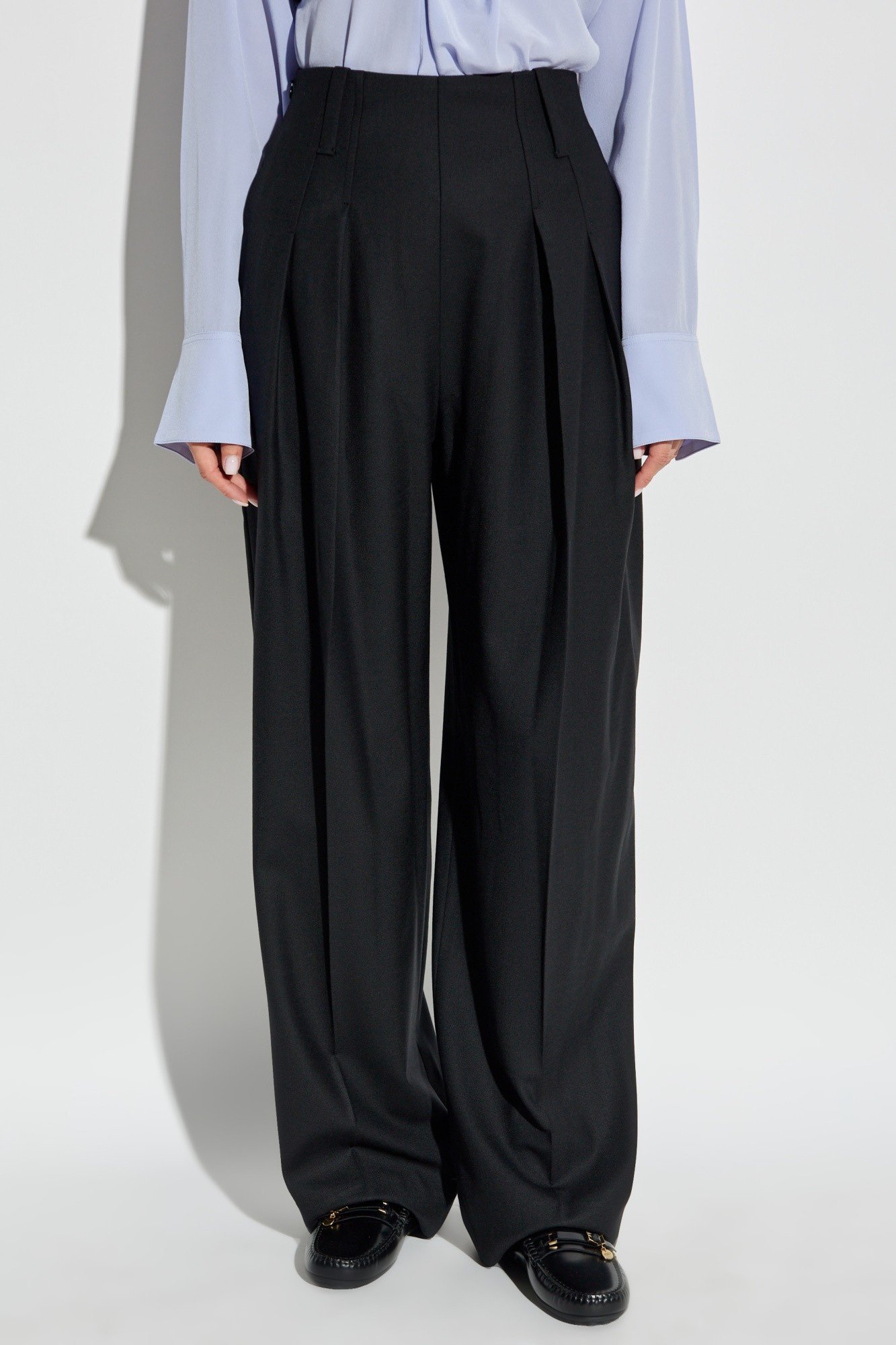 Ці штани з високою талією та широкими штанинами ретельно пошиті, щоб подовжити силует і підкреслити талію, відображаючи майстерність дизайнерки в геометрії та стриману привабливість.