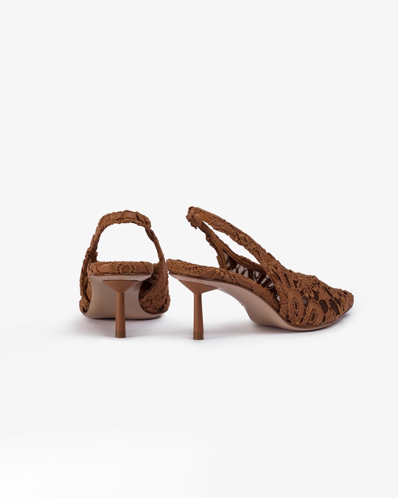 Туфлі-слінгбек Clivage з макраме-мережа та шкіряними акцентами коричневого кольору поєднують ніжну жіночність з універсальним стилем. V-подібний виріз підкреслює стопу, а каблук 60 мм створює збалансовані пропорції.