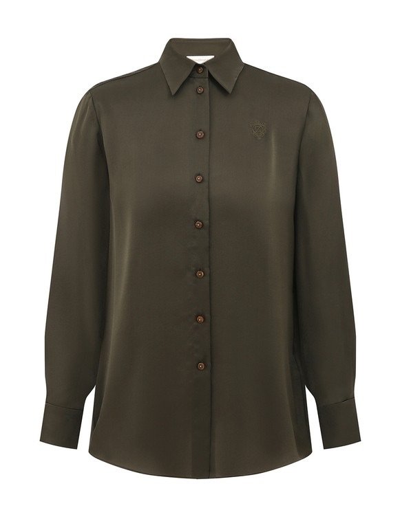 Шовкова сорочка з довгими рукавами, вишитими деталями та класичним коміром.