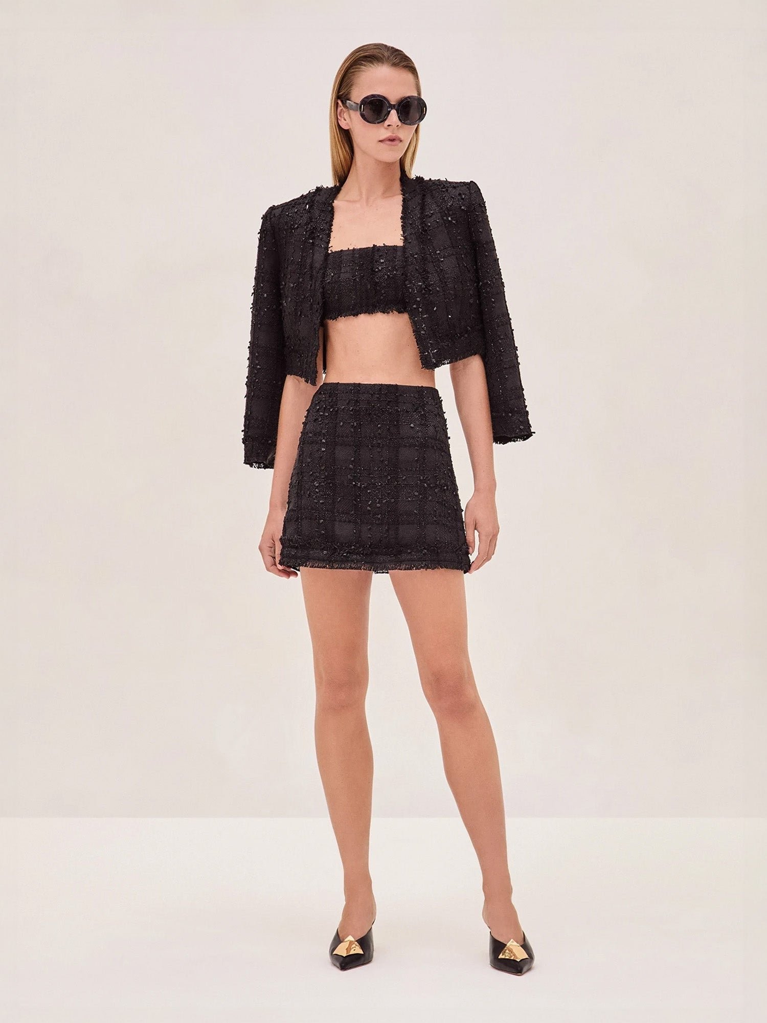 Спідниця Elma — це гладка твідова міні-спідниця з чіткими лініями та приталеним кроєм. Вона ідеально поєднується з топом Estrada та курткою Benning, створюючи злагоджений, вишуканий вигляд.