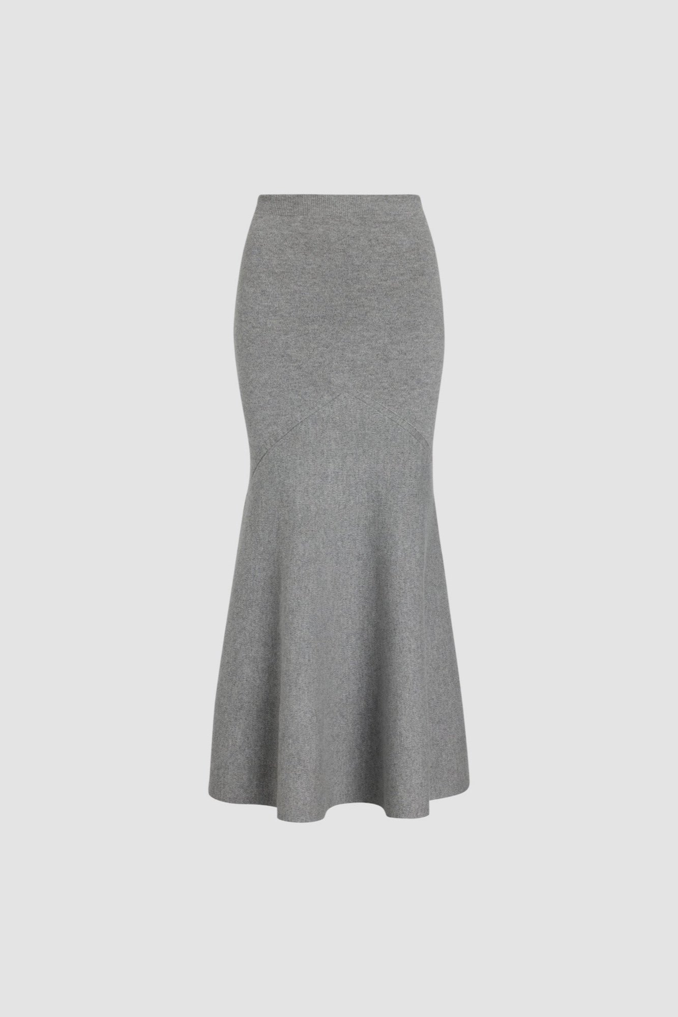 Сіра стійка спідниця з суміші вовни та кашеміру. Велика довжина. Облягаючий силует з баскою. Резинка на талії.