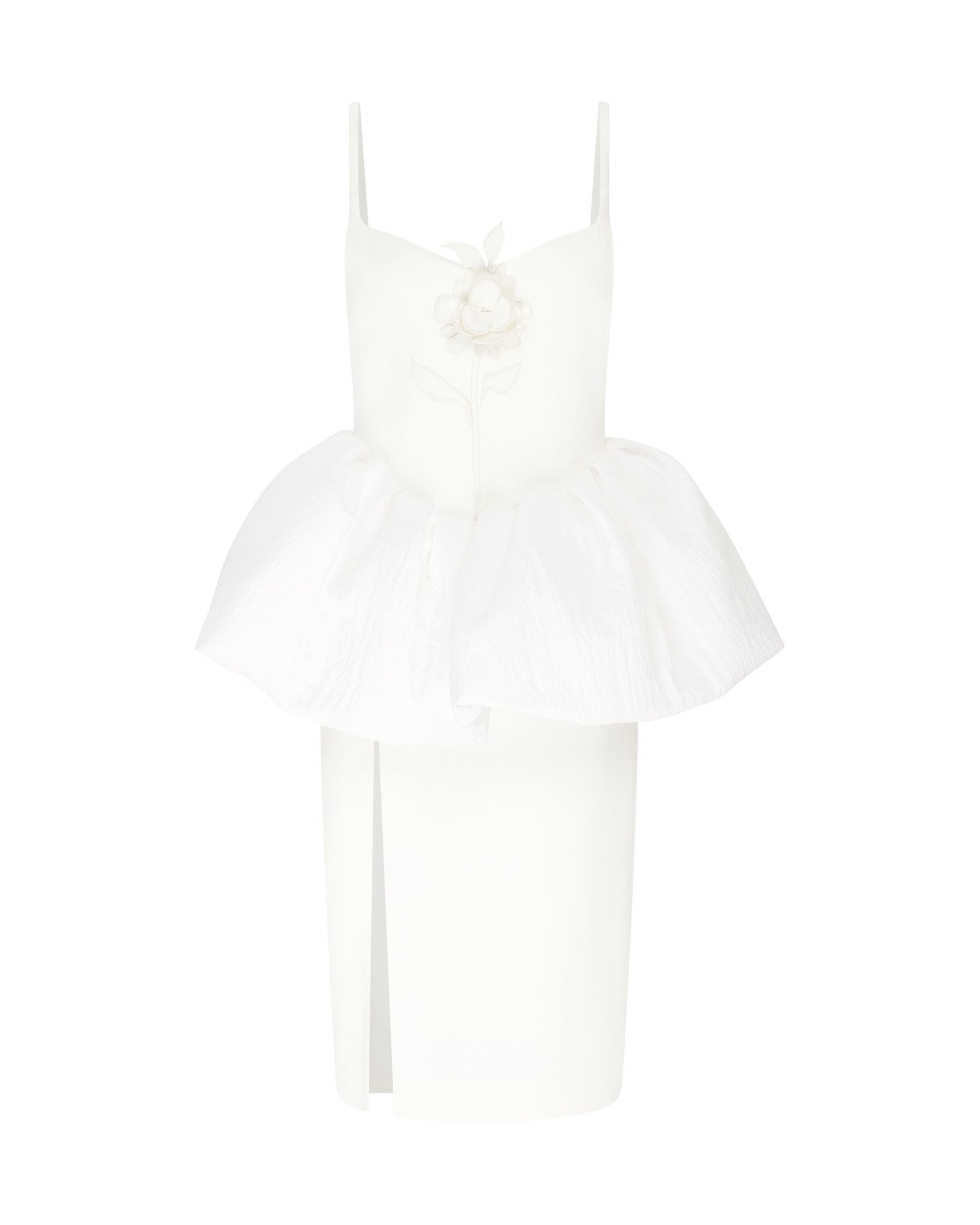Ця сукня міді-довжини має бретелі та легкий виріз у формі серця, вишитий об'ємною трояндою на грудях. Вона має спідницю-олівець з розрізом до стегна та об'ємною тафтяною пишною деталлю на талії. Ззаду є прихована застібка-блискавка.