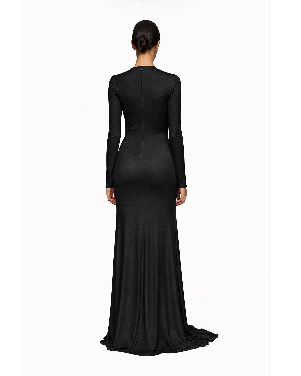 Ця сукня до підлоги має довгі рукави, драпірований виріз декольте та тюлеву вставку з об'ємною вишивкою у вигляді кришталевої троянди спереду. Вона застібається на приховану блискавку ззаду.