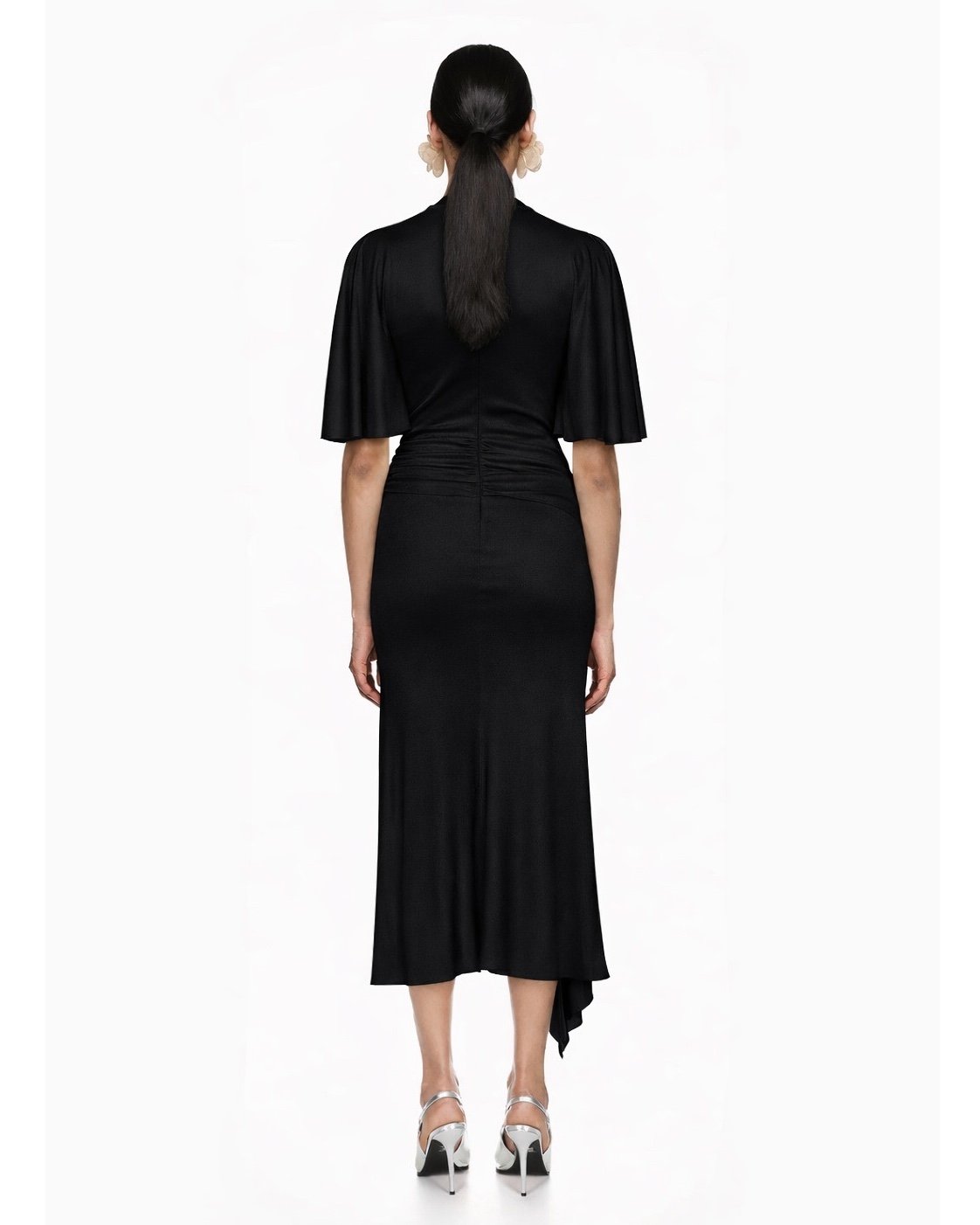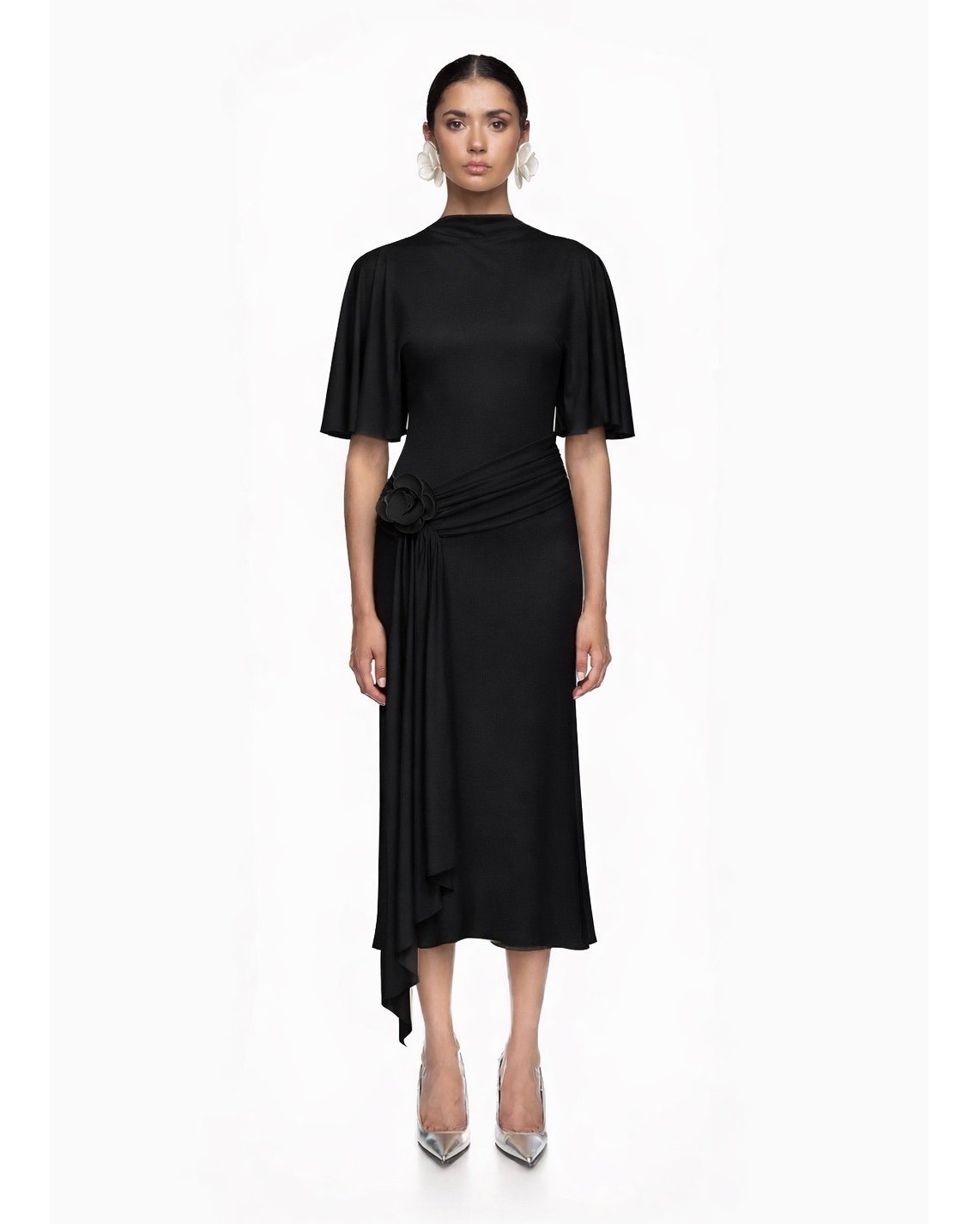 Ця сукня міді-довжини має драпіровані рукави, об'ємну вишивку з мережива та квітів, драпірування на стегнах та подол з воланами. Вона застібається на блискавку ззаду.