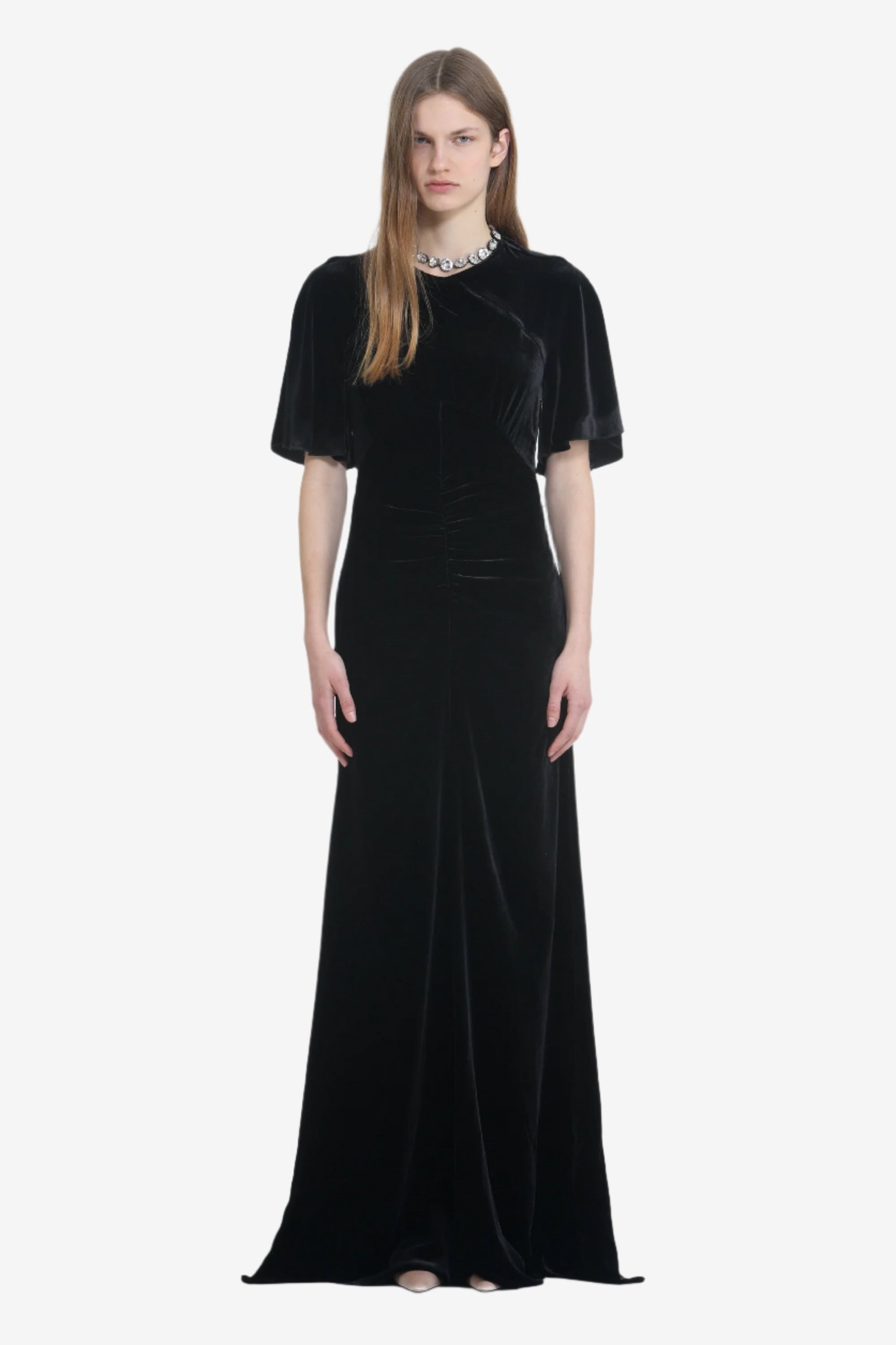 Довга чорна оксамитова сукня з розрізом на спині. Крій облягає груди та злегка розкльошений до низу, з широкими короткими рукавами. Модель має контурні шви та зібрану деталь по центру спереду. Оксамитова тканина надає сукні м'якої текстури та блискучого вигляду.