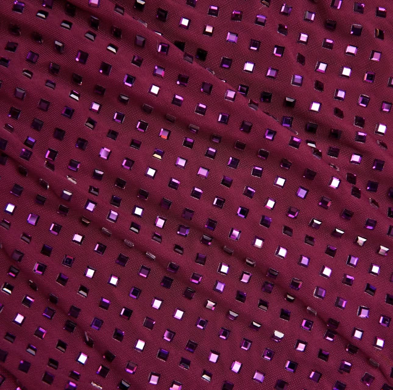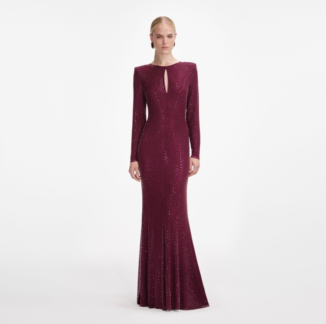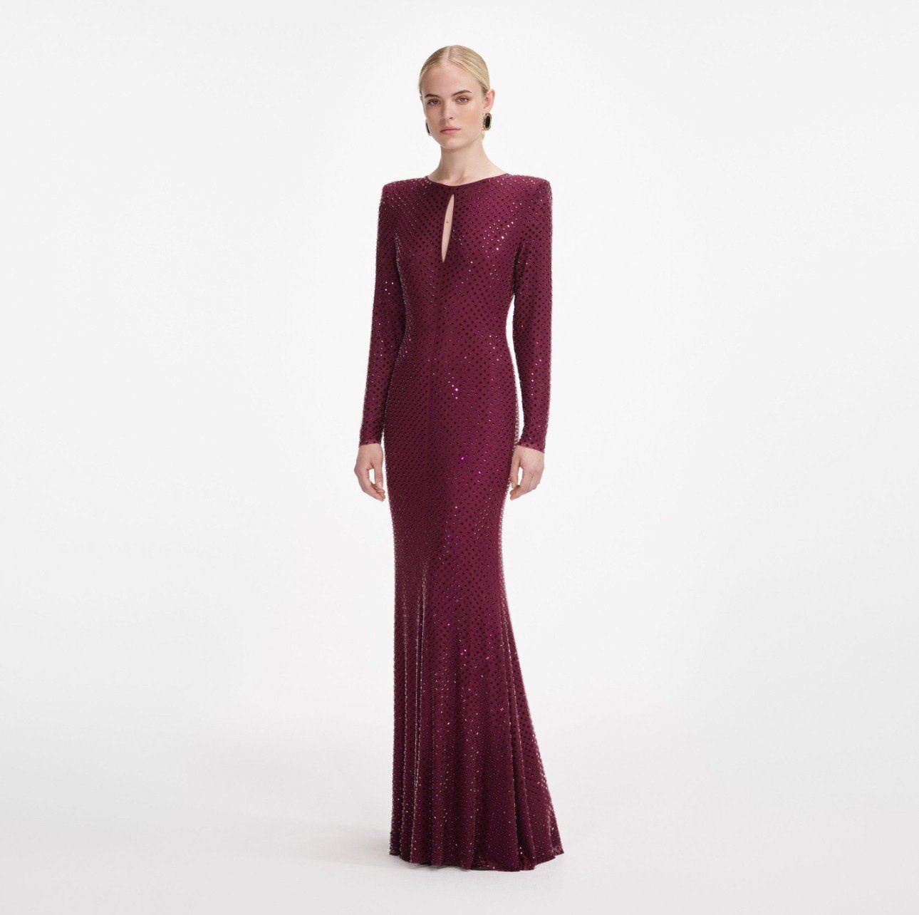 Ця чуттєва максі-сукня, що сяє бордовою сіткою зі стразів, спадає від вирізу-замкової щілини до розкльошеної спідниці. Довгі рукави підкреслюють елегантний силует – поєднуйте з туфлями на підборах, щоб підкорити місто.
