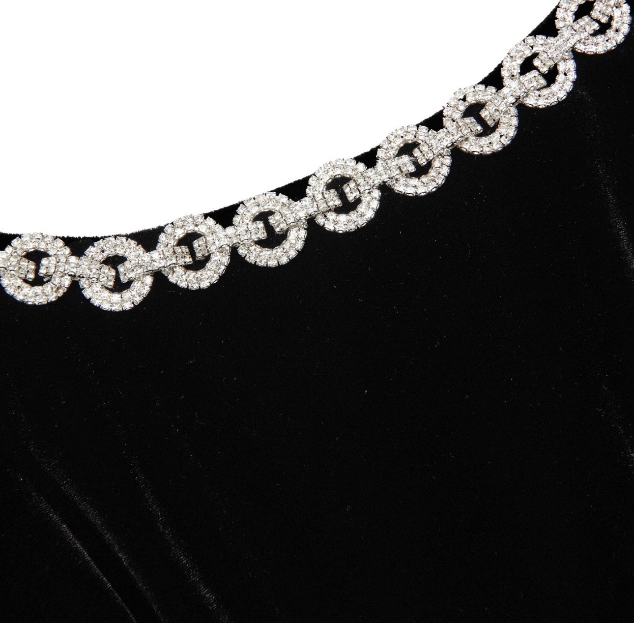 Виготовлена з чорного оксамиту для дози темної романтики, ця сукня може похвалитися привабливим вирізом Бардо, стягнутою талією та кокетливим розкльошеним подолом. Кришталеві ланцюжки додають нотку непереборного блиску.