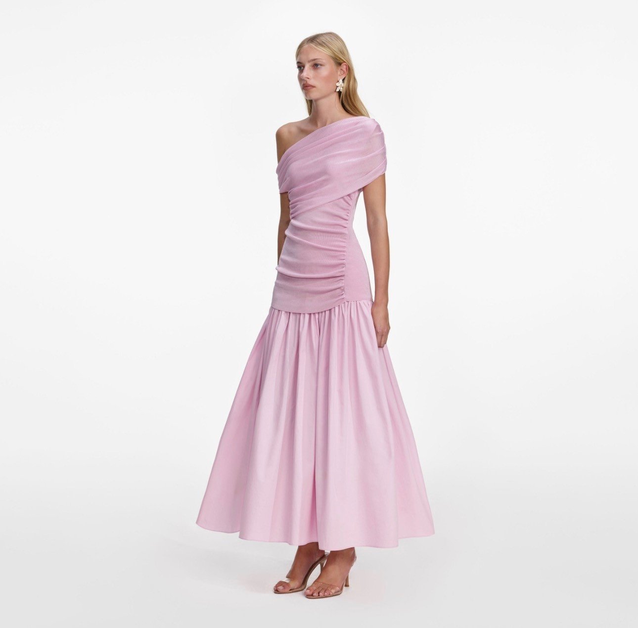 Провокаційна рожева сукня міді з драпірованим вирізом вражає своїм асиметричним вирізом з відкритими плечима та рельєфною зібраною лінією талії. Пишна спідниця забезпечує драматичний вигляд з кожним рухом на танцполі.