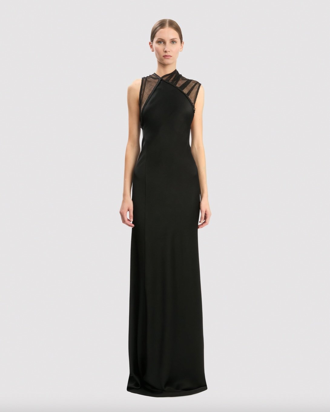 Виготовлена з креп-атласу з косим вирізом, вона приталена вище лінії талії та має плавний виріз знизу. Складки та виточки на ліфі додають чуттєвості, а оздоблення на вирізі та проймах додає вишуканості.