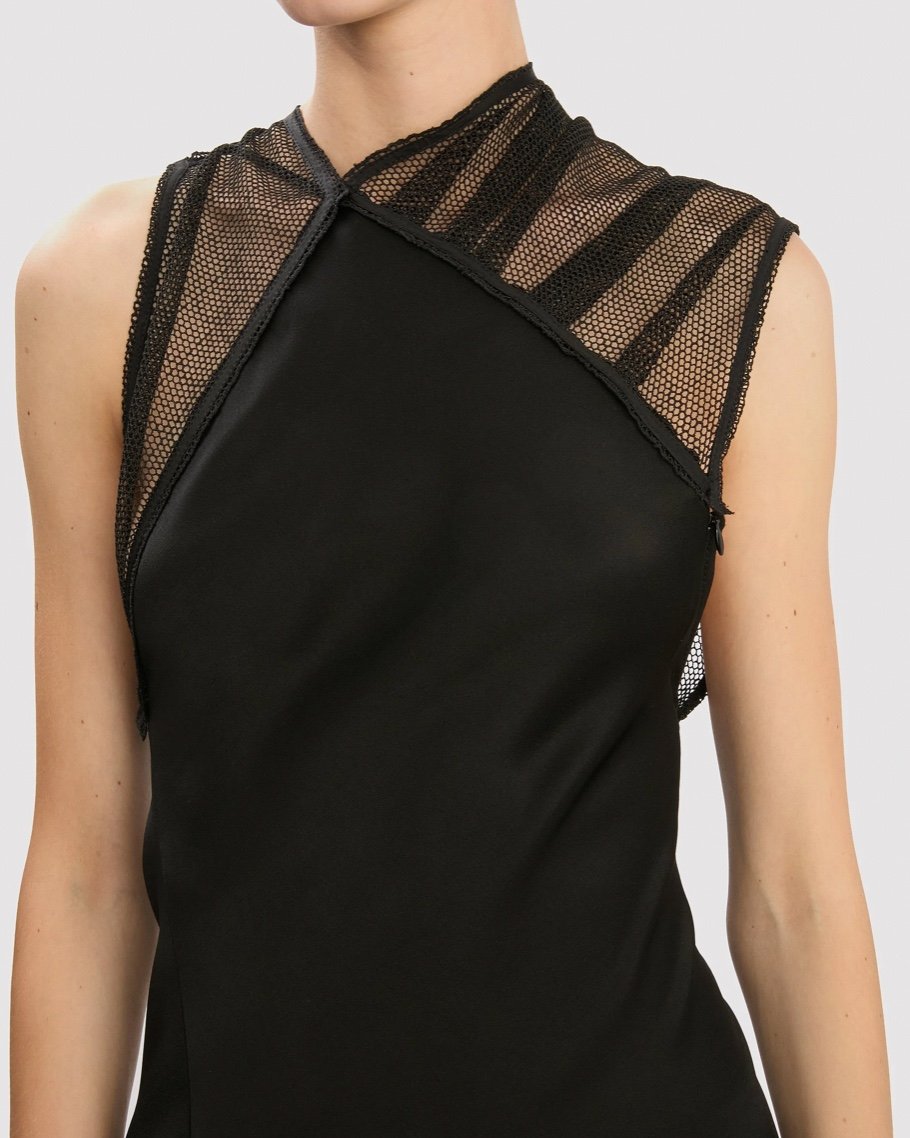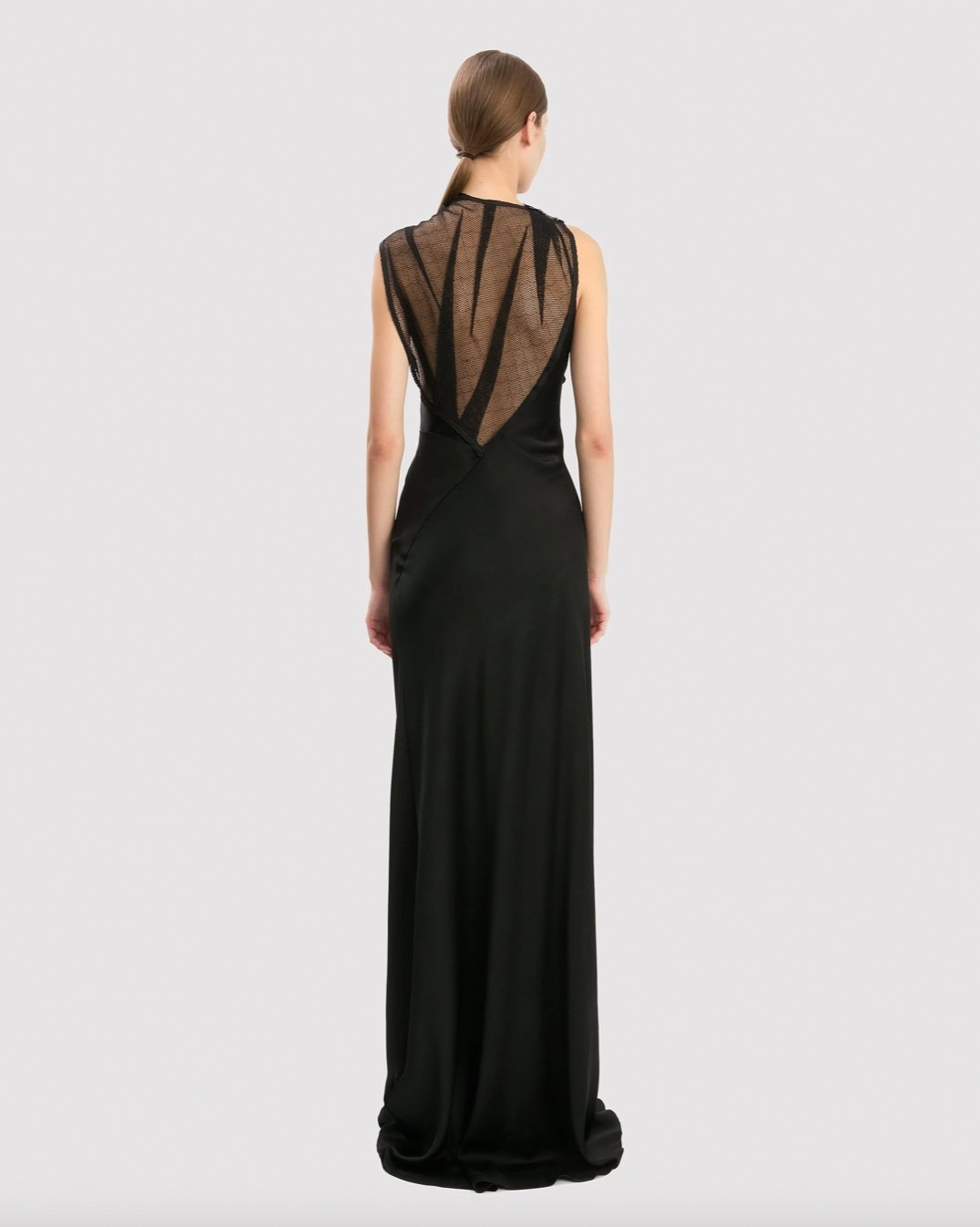 Сітчаста деталь на верхньому ліфі та глибокий V-подібний виріз ззаду надають цій сукні особливого шарму.