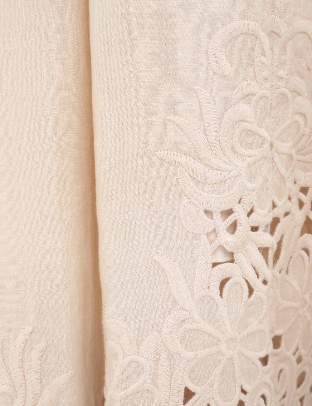 Плавна сукня Wylie з вишивкою кремового кольору з колекції Resort Swim 2025. Лляна сукня міді з довгим рукавом, високим вирізом, гудзиками по центру та вишивкою.