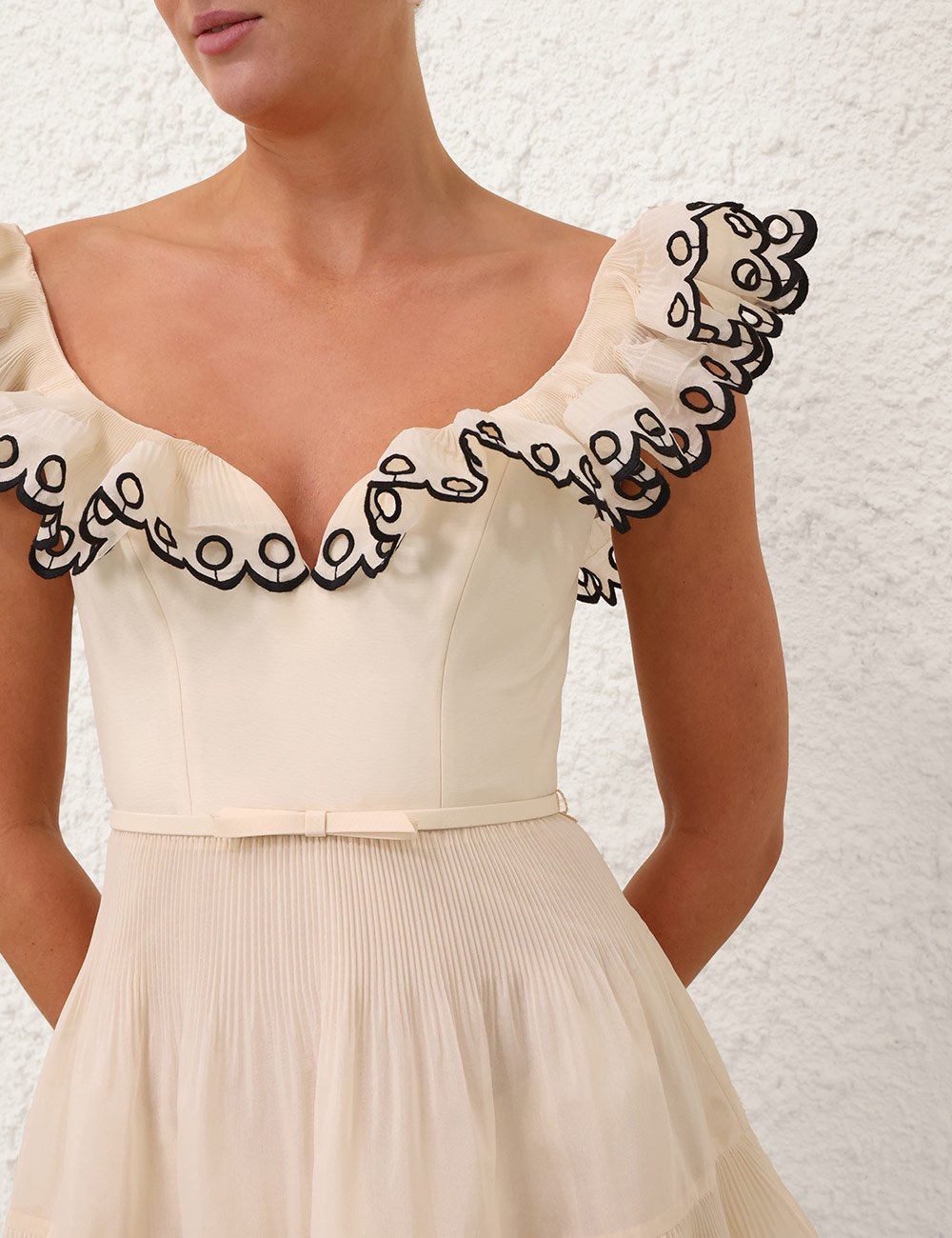 Сукня міні-довжини з V-подібним вирізом у формі серця, рюшами, знімним поясом на талії та багатоярусною плісованою спідницею.