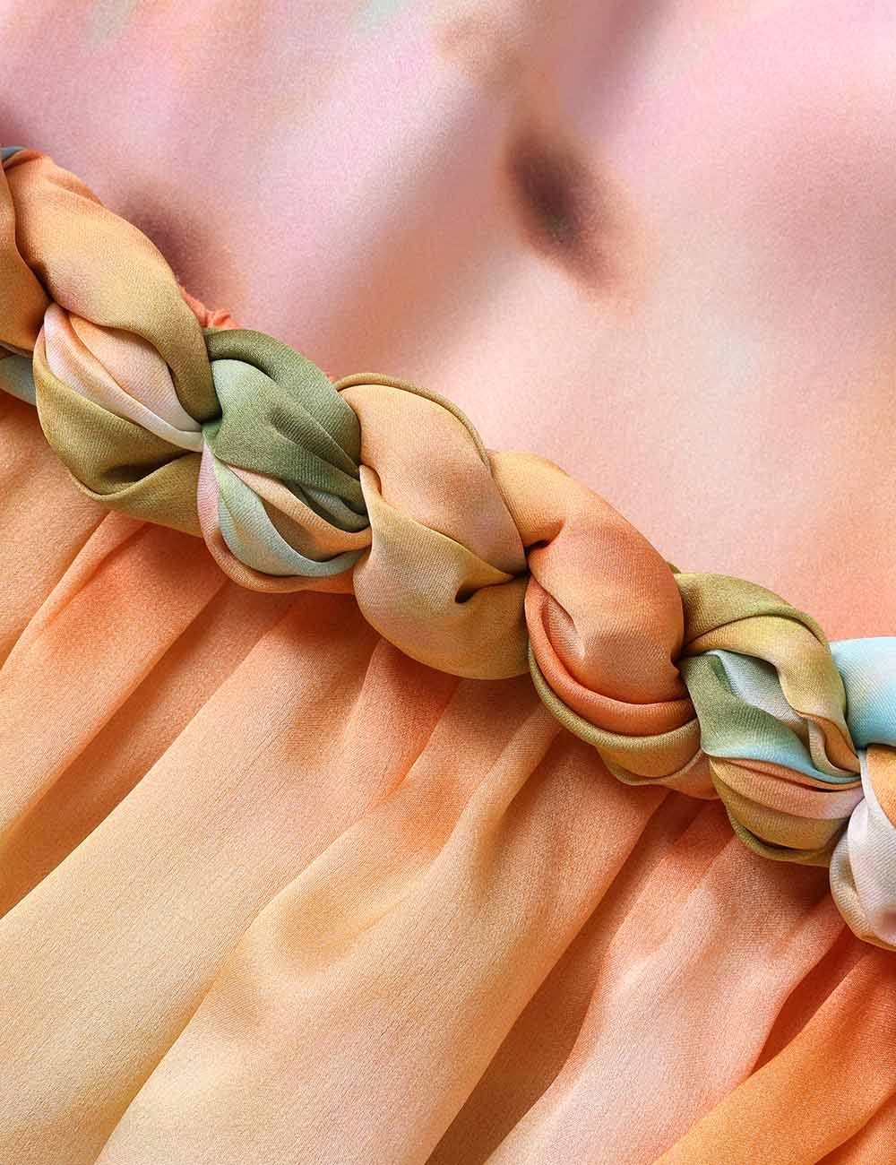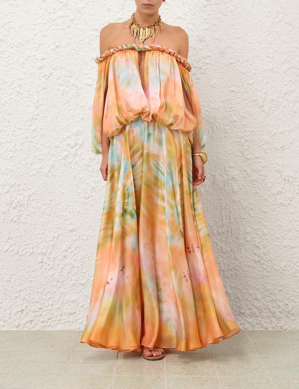 Сукня Luna Twist Billow кольору коралового тай-дай з нашої колекції весна 2026 року, Kindred Spirit. Шовкова сукня максі з відкритими плечима, заниженою талією, об'ємним силуетом, рукавами-розмірами та плетеною обробкою.