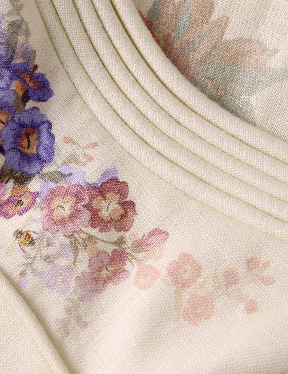 Сукня міді Alchemy кремового кольору з квітковим принтом з нашої весняної колекції 2026 року, Kindred Spirit. Льняна сукня міді з V-подібним вирізом горловини, регульованими бретелями, фіксованим поясом, оздобленою гофрованим ліфом ззаду та м'яко розкльошеним низом.