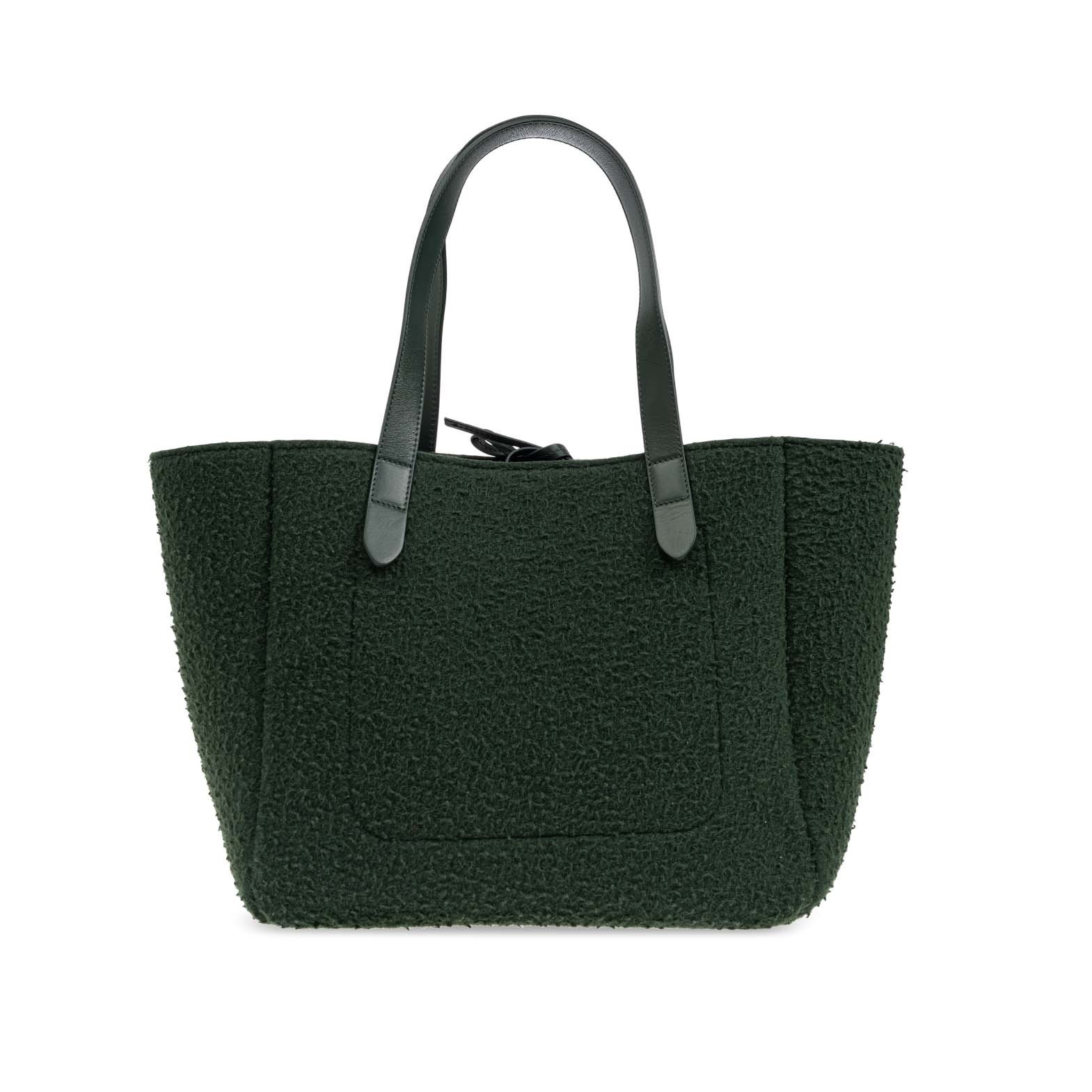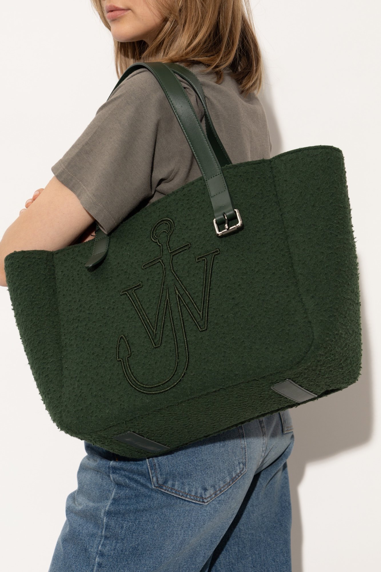 Сумка-шопер від JW Anderson – це вишукана інтерпретація міської елегантності та сучасного дизайну. Її класичний, плавно трапецієподібний силует гармонійно поєднує просторість з легкою формою. Зовнішній шар полонить ніжною текстурою букле, м’якість якої чудово контрастує з гладкістю регульованих ручок з телячої шкіри – обидва елементи виконані в глибокому темно-зеленому відтінку.